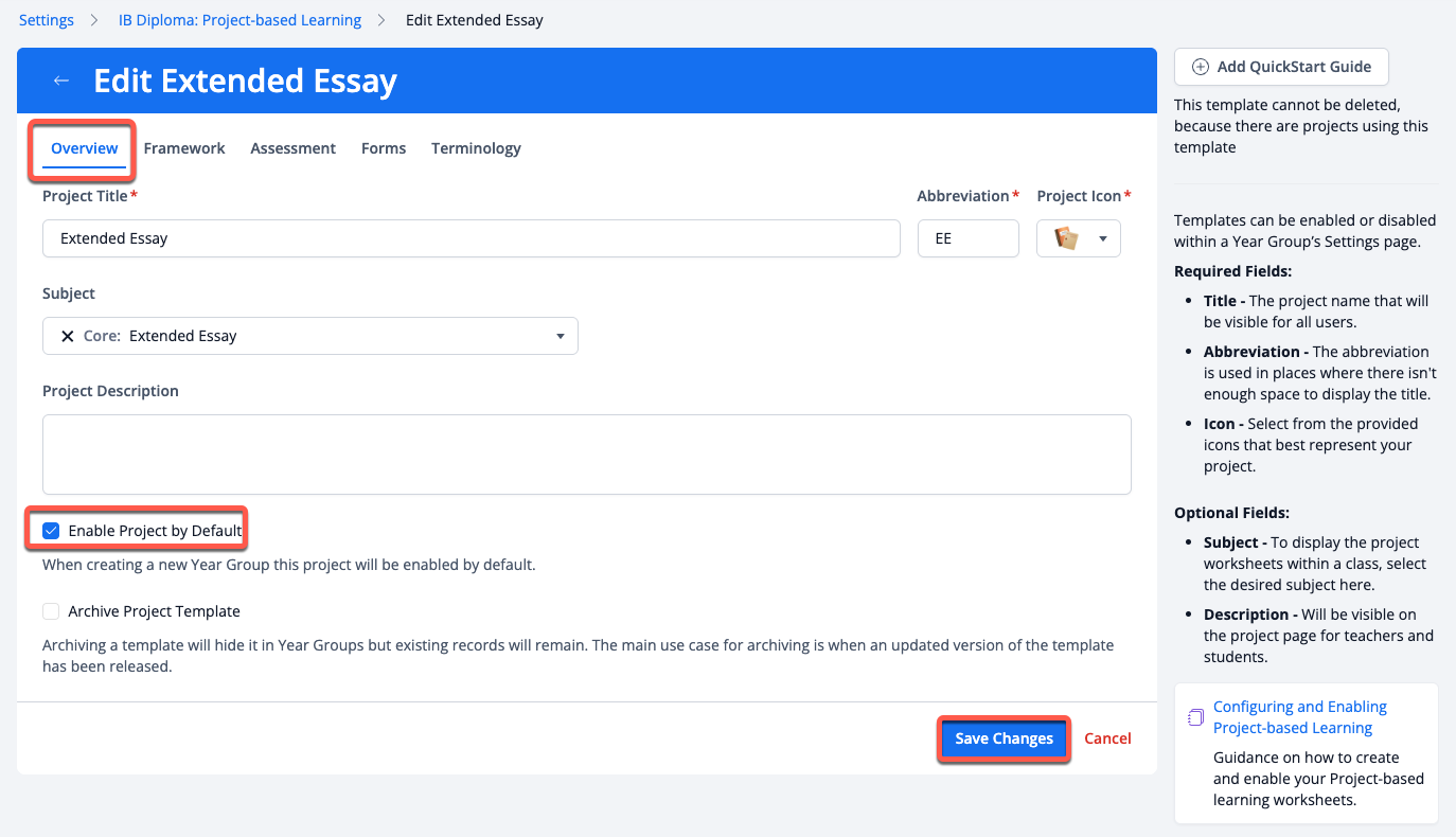 If you select the Enable Project by Default, the template will be enabled automatically on any new IB Diploma Year Group created.