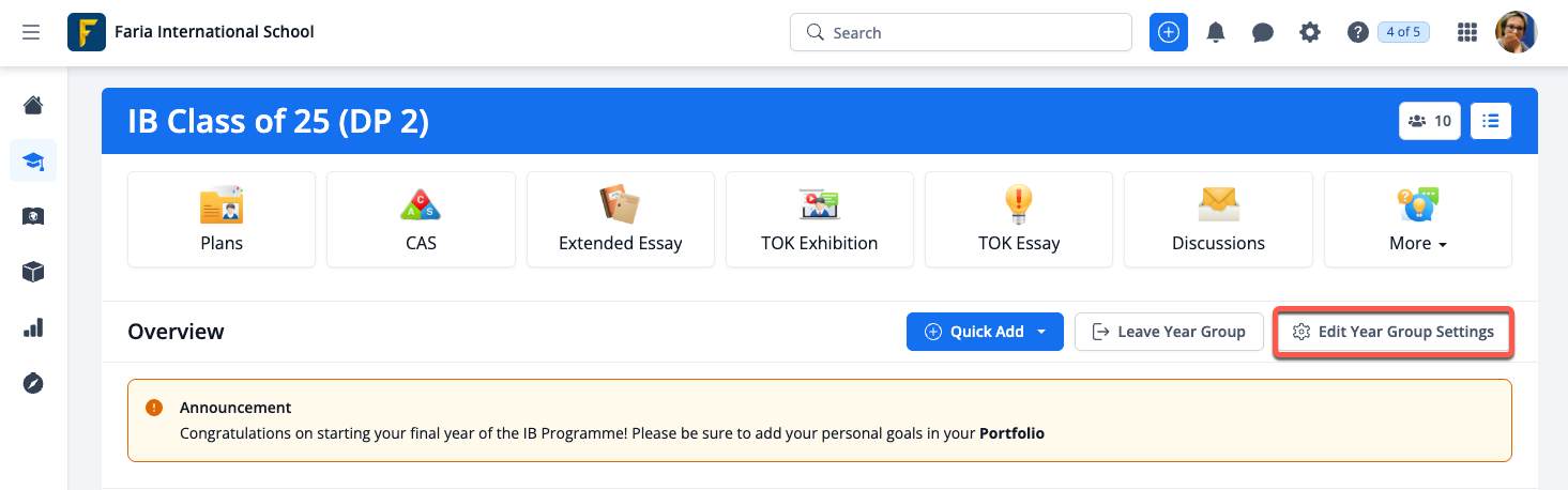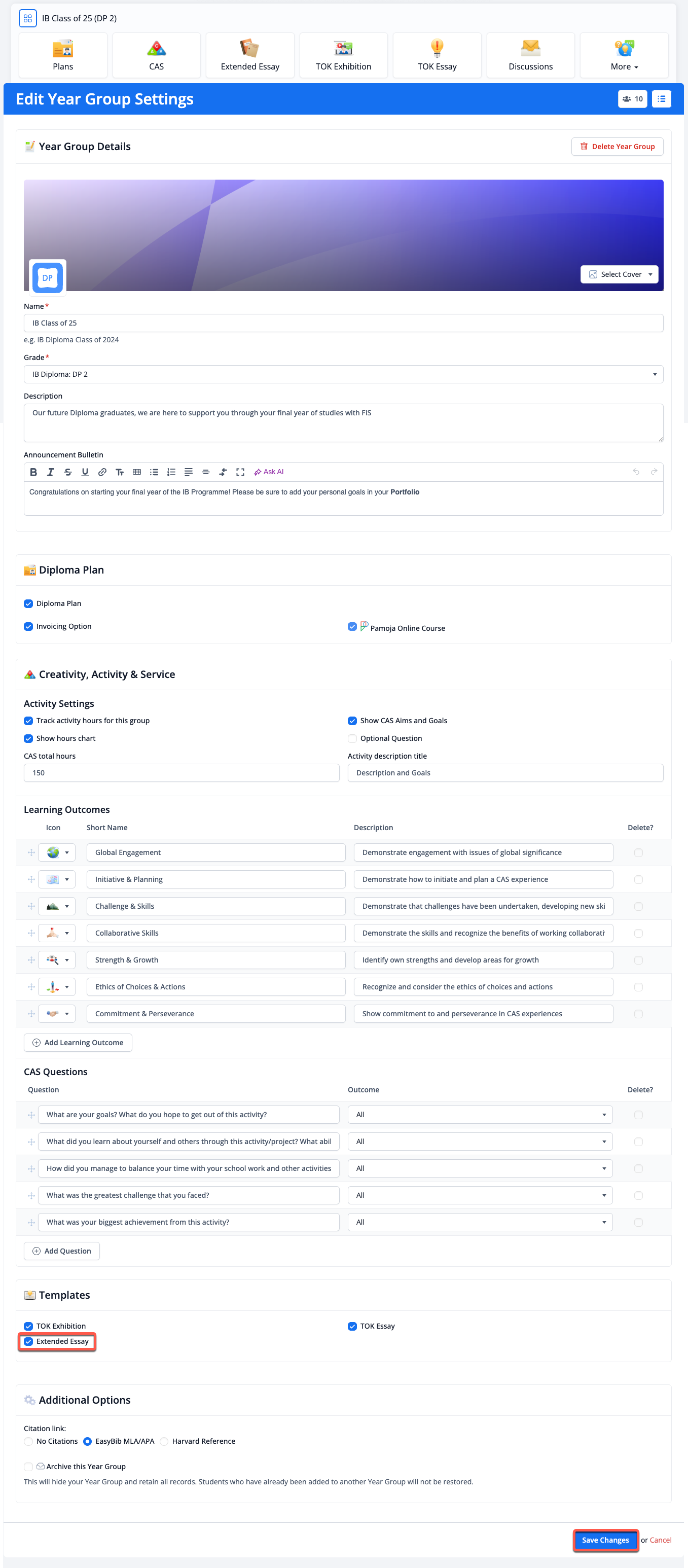 EE can be enabled within existing Year Groups via Year Group > Edit Year Group Settings, tick Extended Essay > Save Changes.