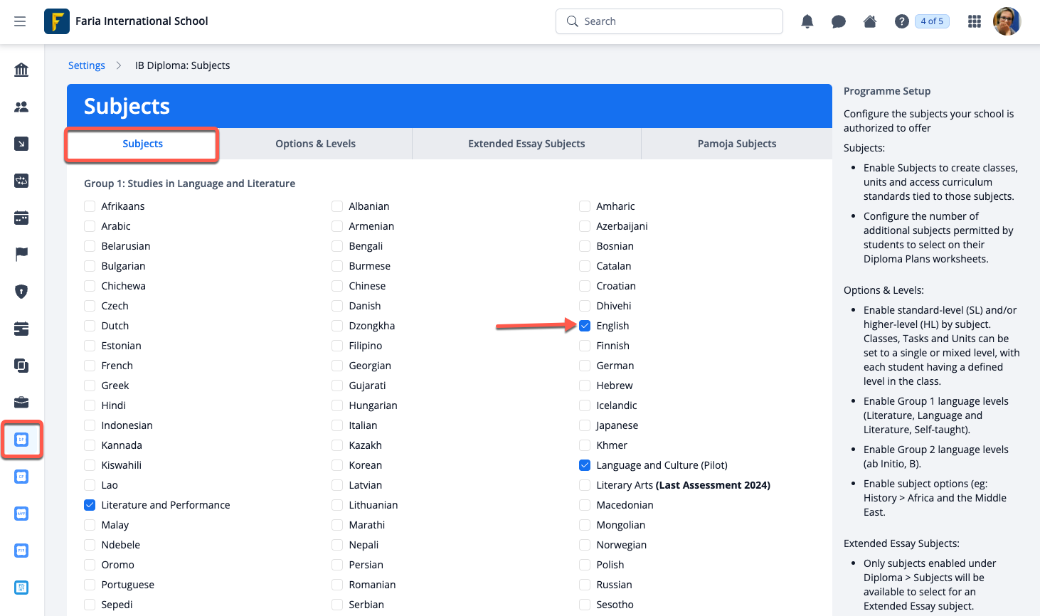 After you have selected the DP Subjects offered at your school, navigate to the Extended Essay Subjects tab under Settings > IB Diploma > Subjects. From here you can enable the relevant Extended Essay Subjects and click Save Changes.