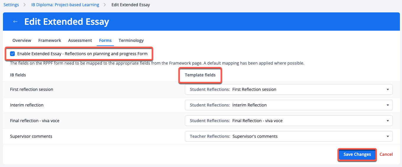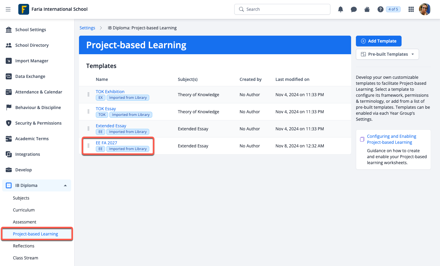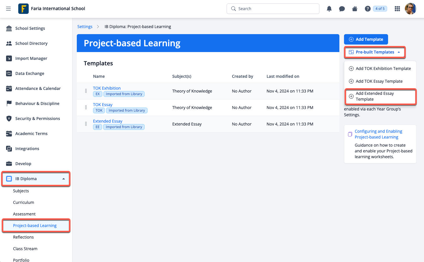 Via Settings > IB Diploma > Project-based Learning, administrators can click on Pre-built Templates to add the Extended Essay worksheets that will come pre-populated. Multiple versions of the worksheet can be added.