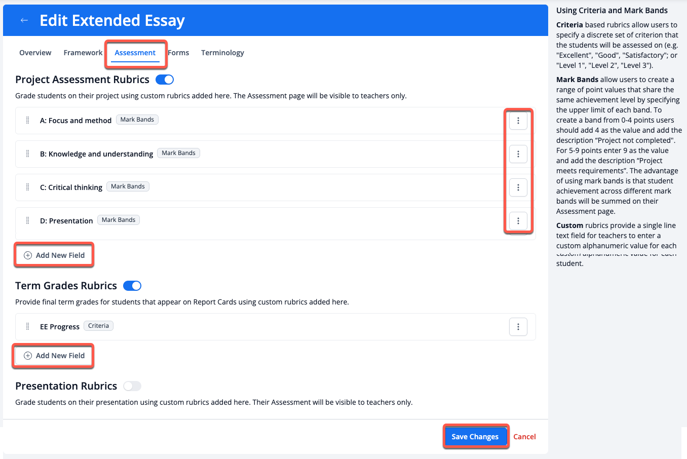 Extended Essay Assessment criteria are pre-built in our template. However, both Project Assessment Rubrics and Term Grades Rubrics are customizable to allow schools to add additional assessment options.