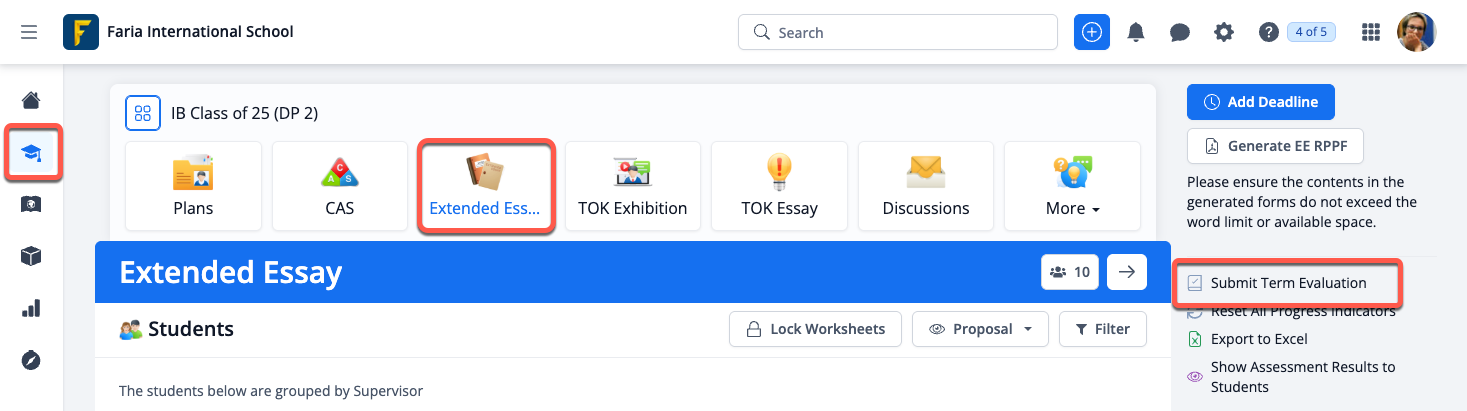 Via Year Group > Extended Essay click on Submit Term Evaluations from the right navigational menu to submit EE term grades and comments if the Term Grades Rubric was enabled and configured in the Assessment page of the EE Project-based Learning template.