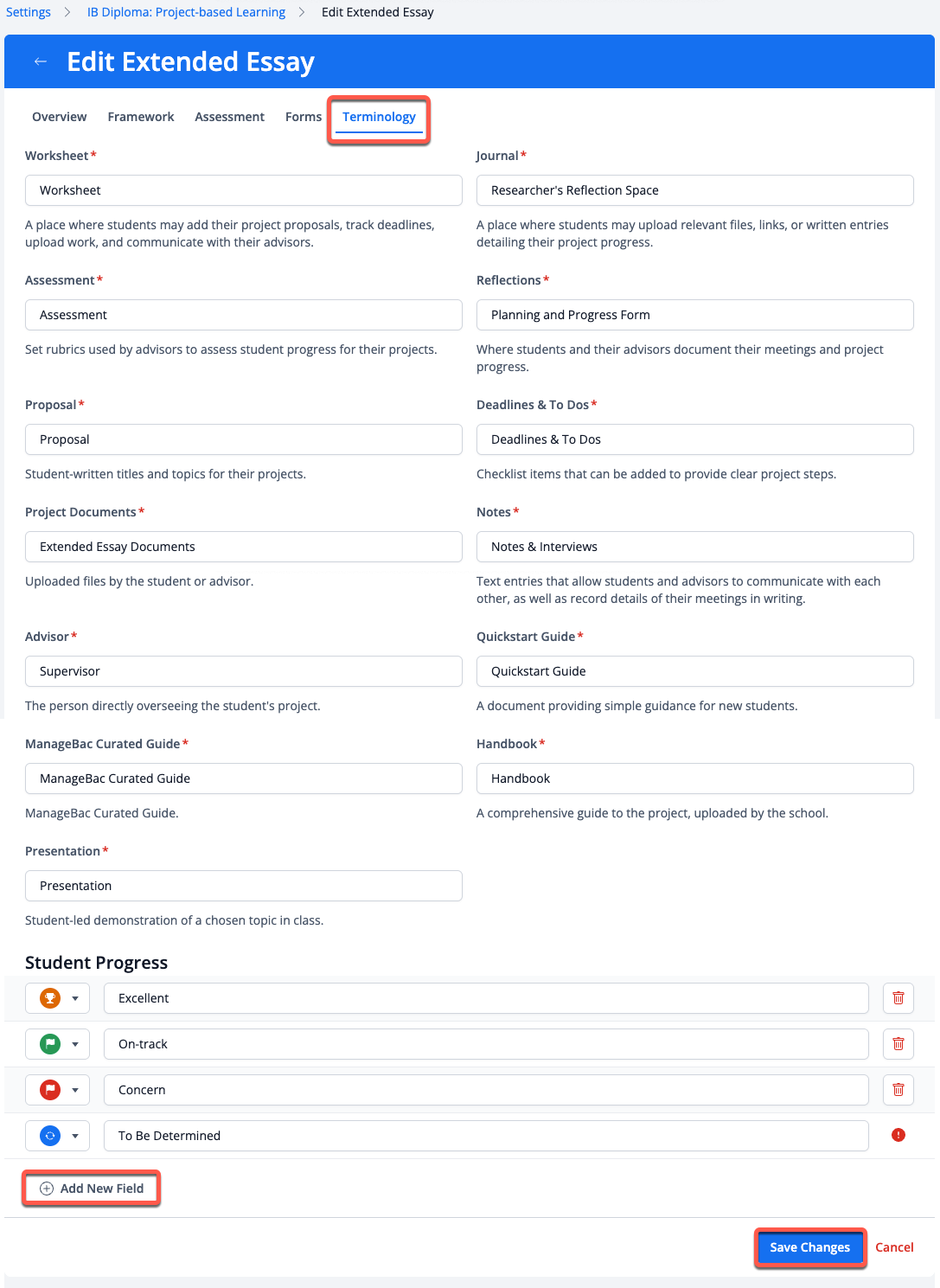 The Pre-built Templates will come pre-populated with all the requirements to support the Extended Essay. However, schools can customise them further by clicking on them.