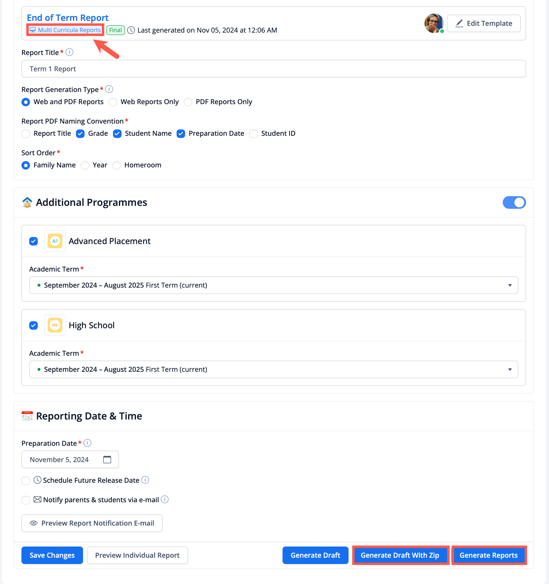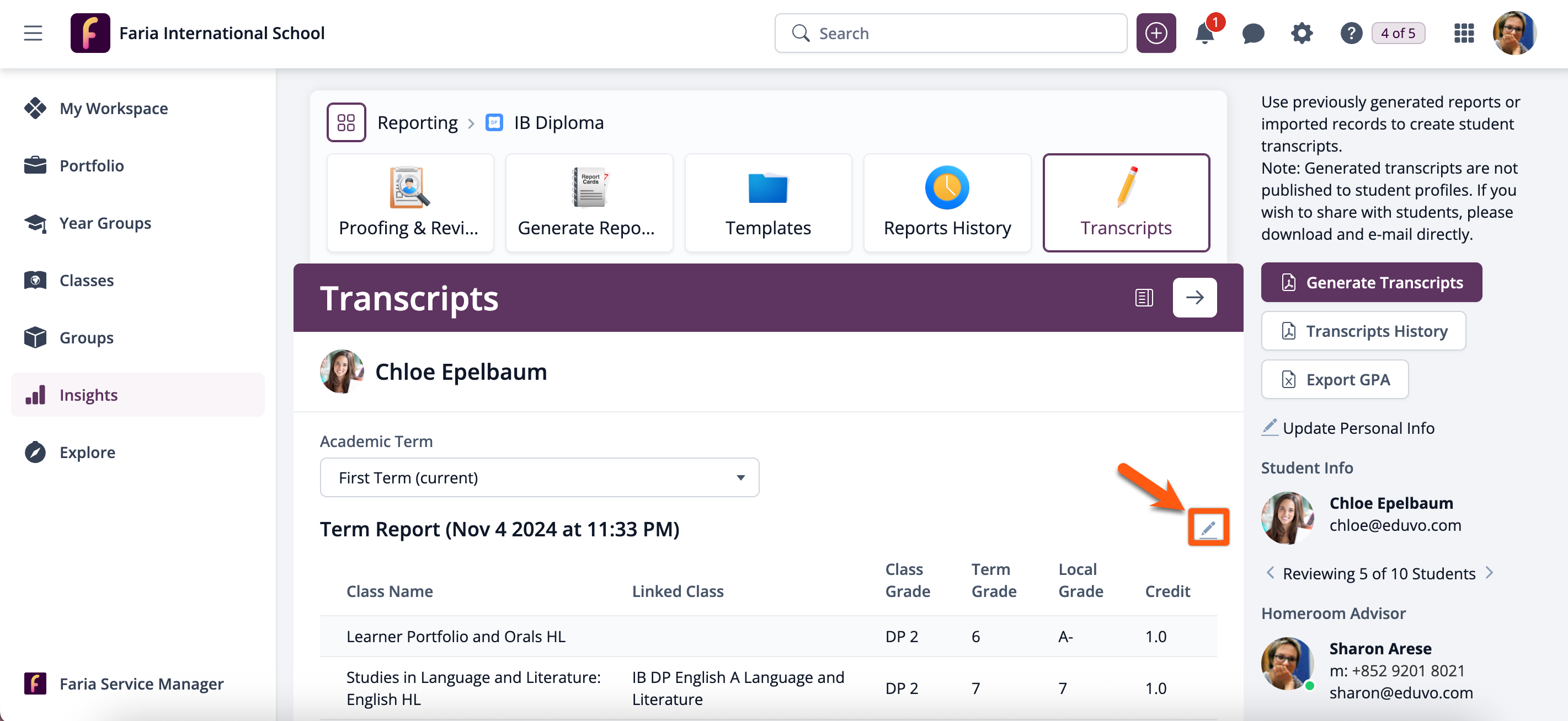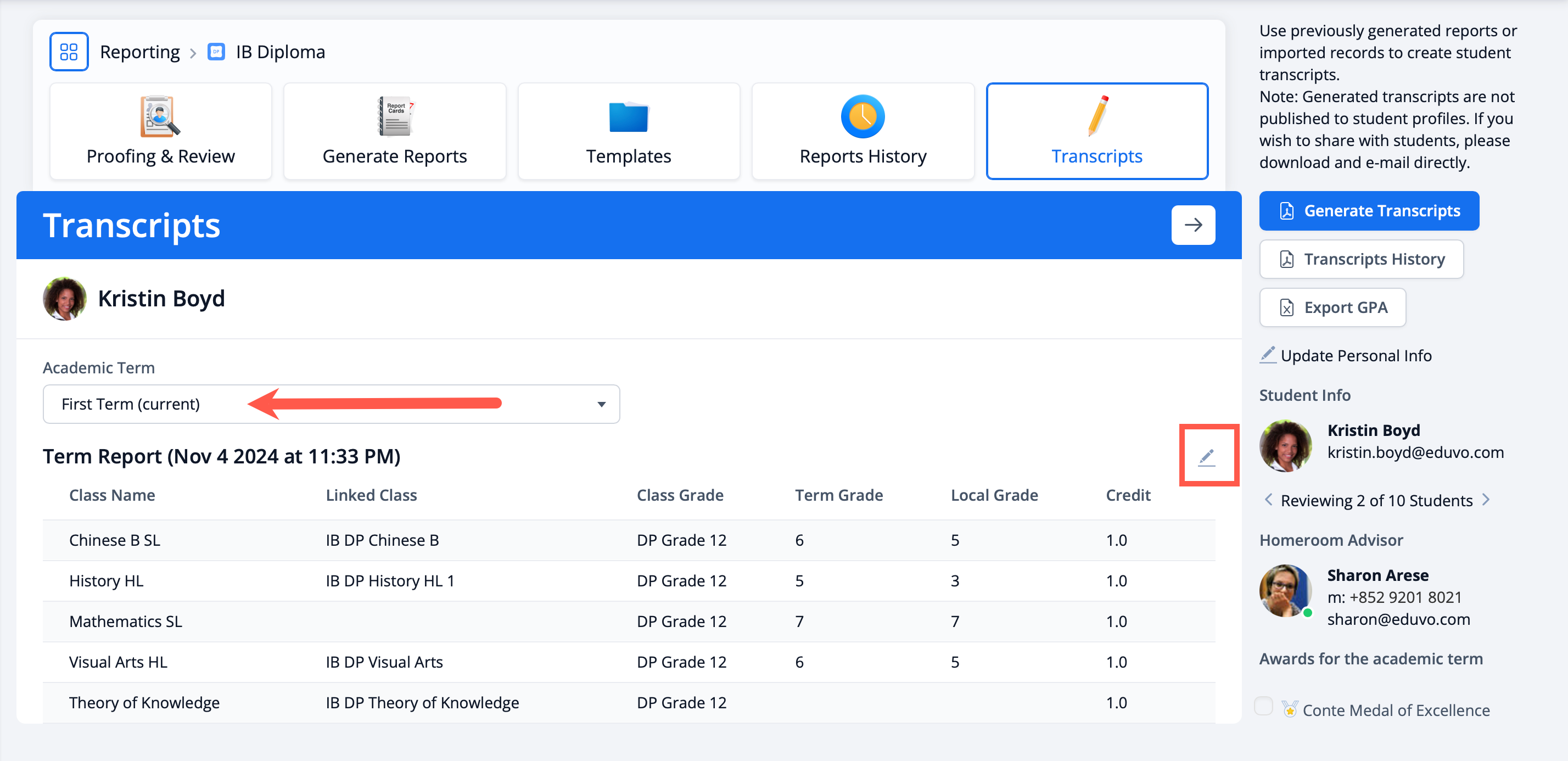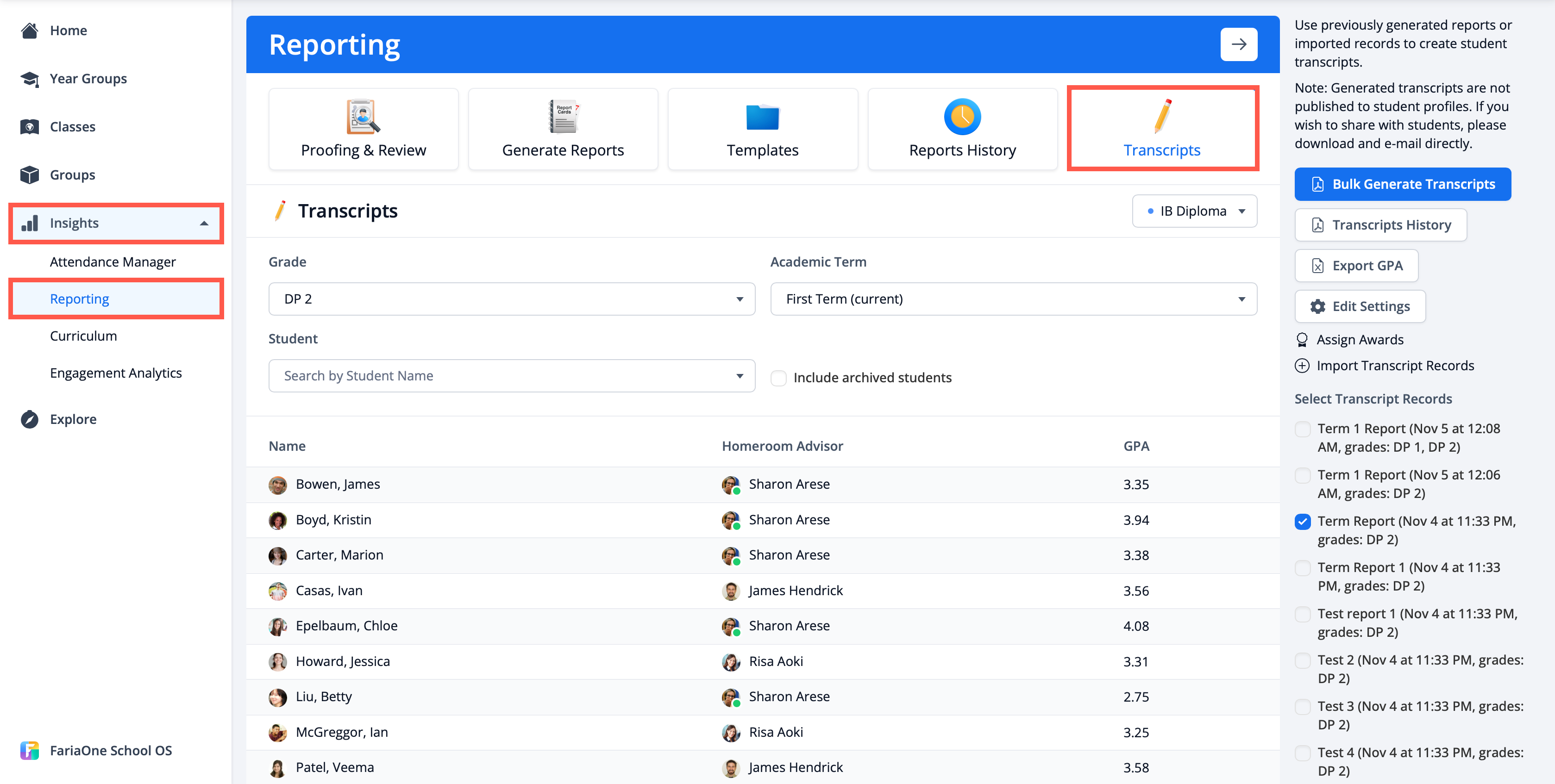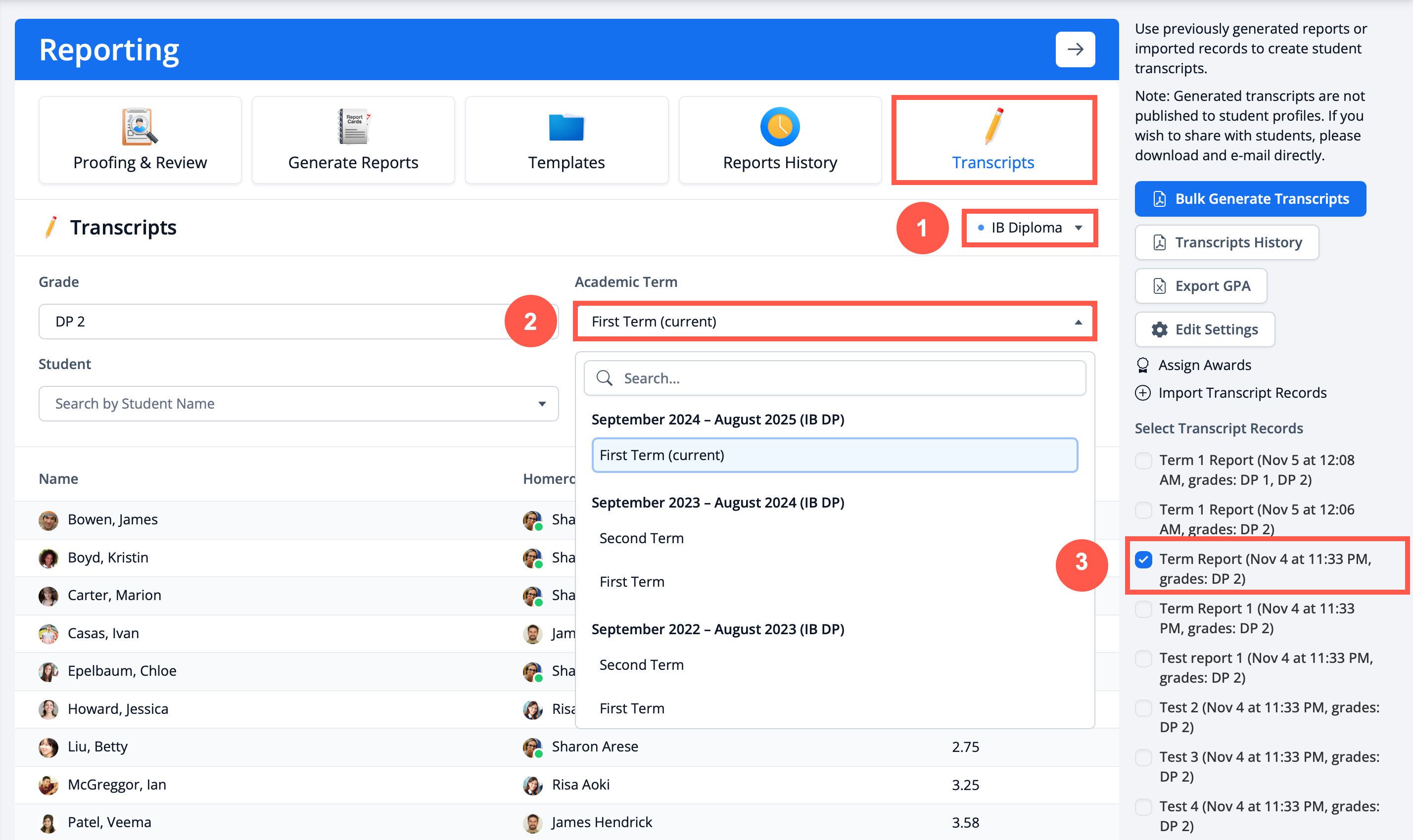 Once all reports have been selected for each academic term, bulk generate transcripts for all DP & MYP students by clicking Bulk Generate Transcripts. Previously generated transcripts are accessible via the Transcripts History button.