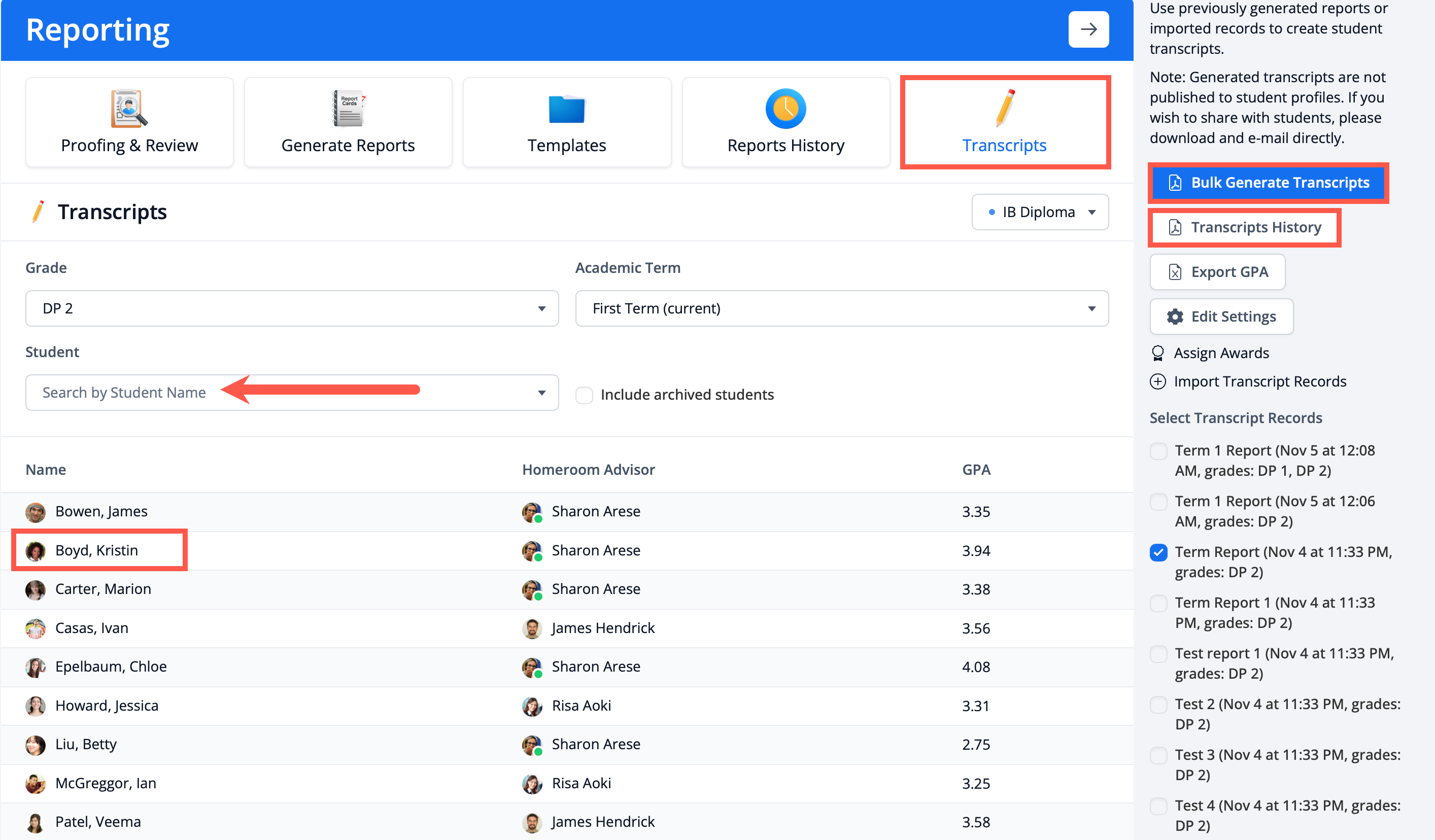 You can also view and generate transcripts for individual students by clicking their name in the roster or by searching the student's name in the search box.