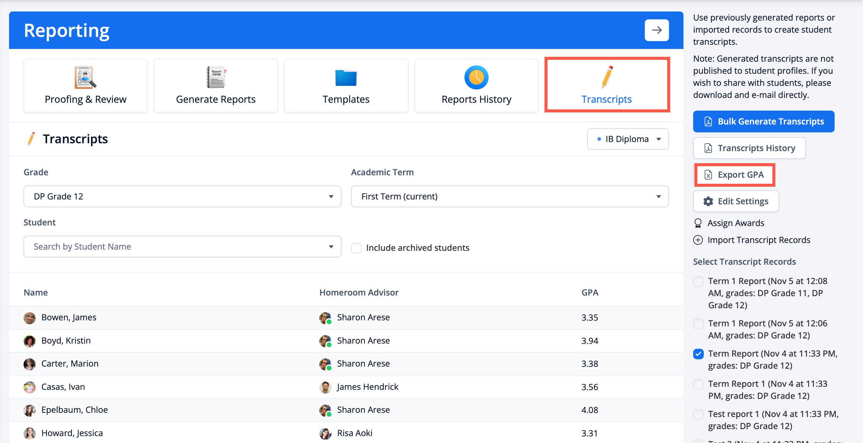 To export students' grade point averages (GPA) to Excel, navigate to Reporting > Transcripts > click Export GPA.