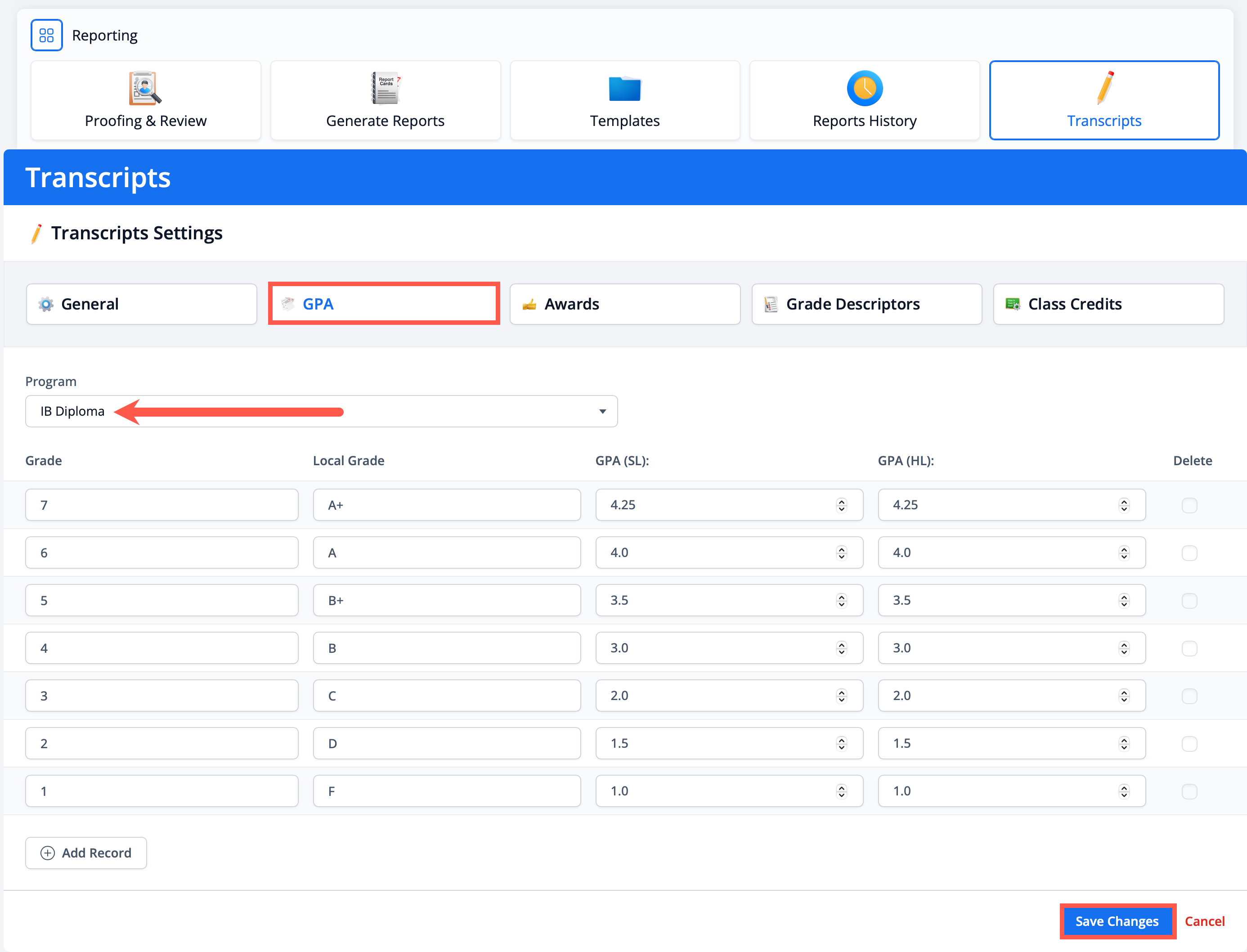 The GPA values can be configured for your school via Reporting > Transcripts > Edit Settings > GPA.