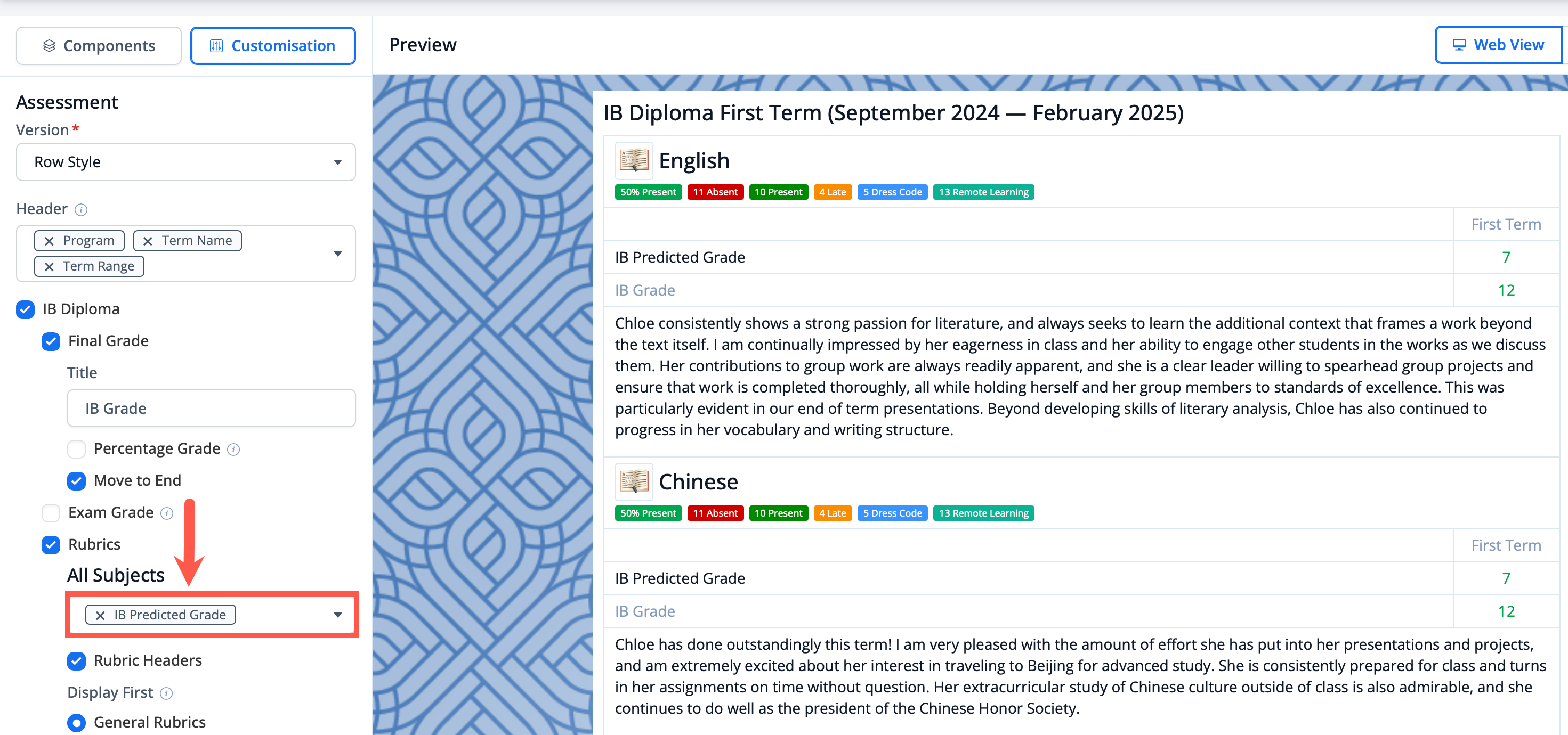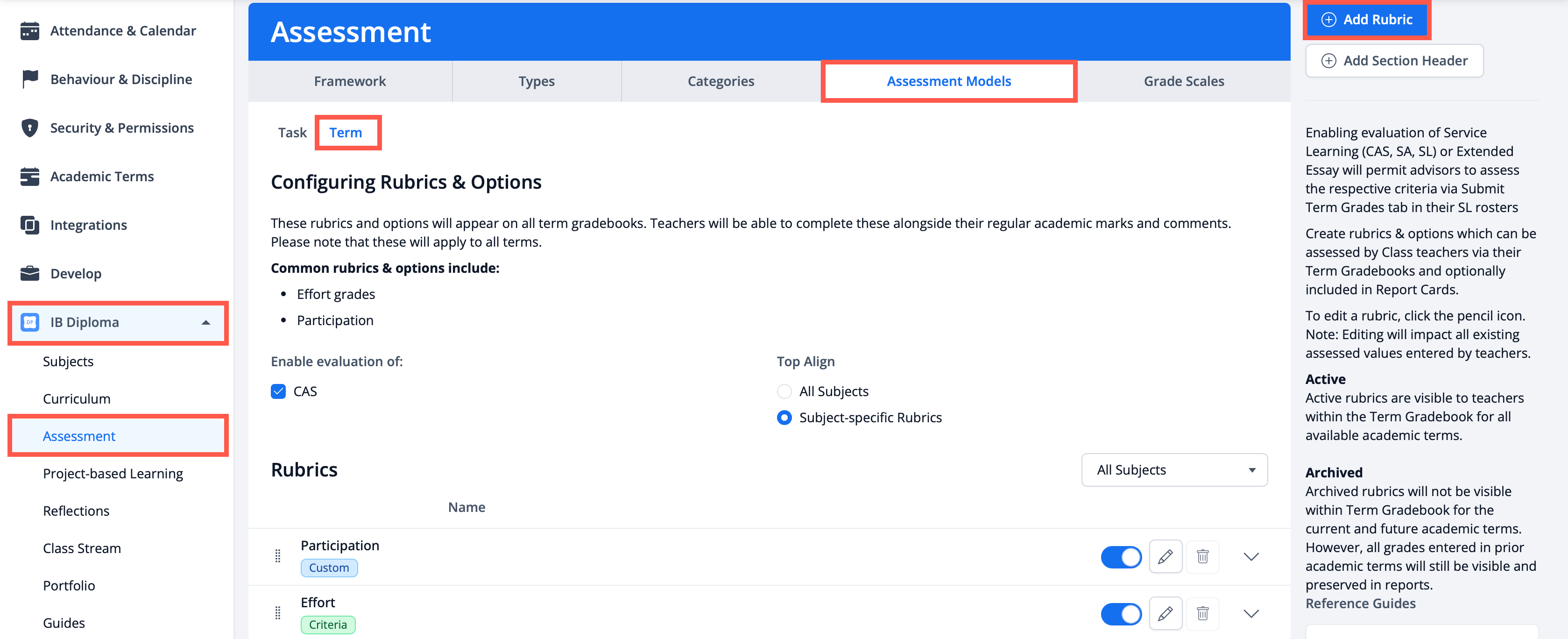 - Configure the rubric(s) via Settings > Select Programme > Assessments > Assessment Models > Term Grades > Edit an existing rubric or add a new Rubric > Enable the “Add rubric to Transcripts” and Save changes.