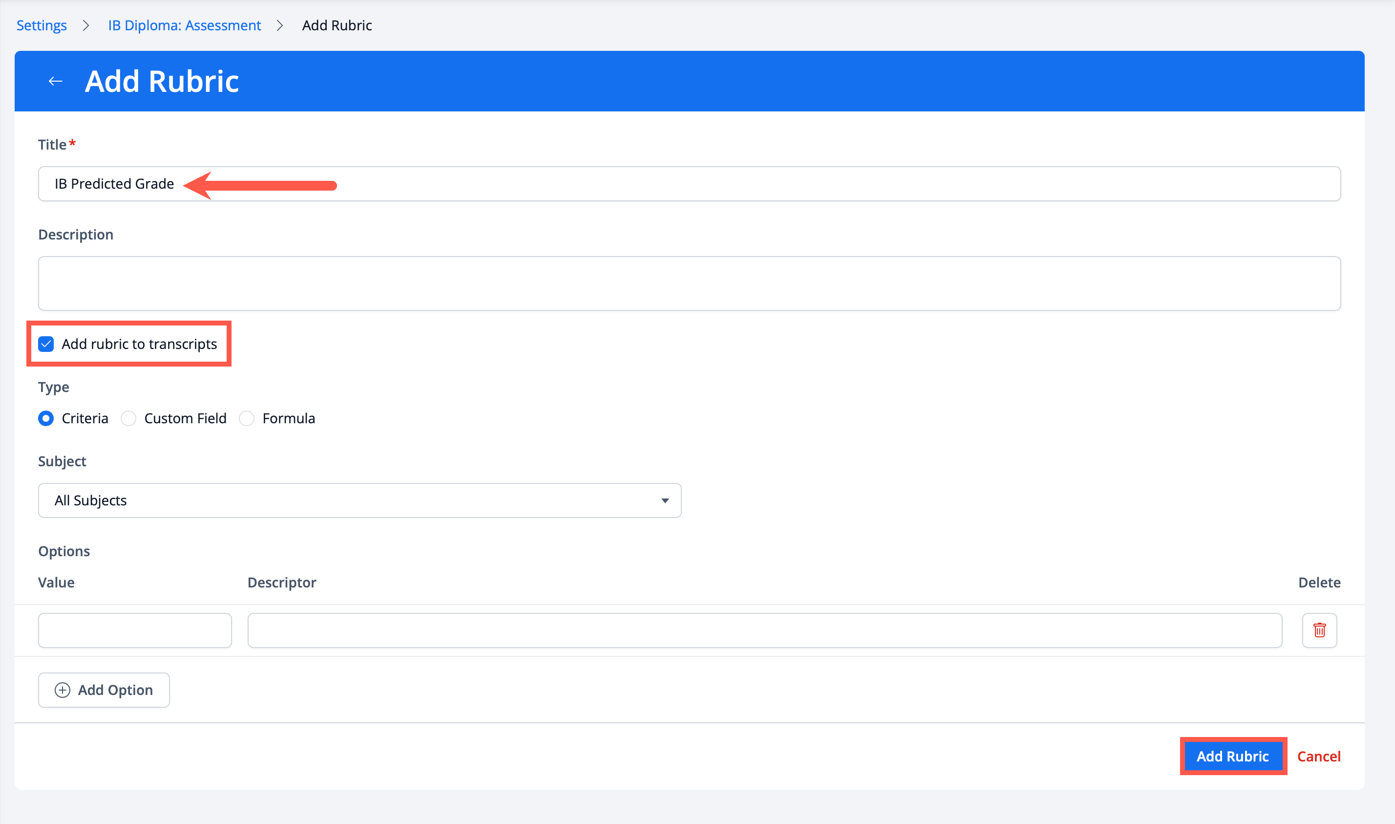 - Navigate to Reporting > Transcripts > Edit Settings > under the General tab select “Custom Rubric” > Save Changes.