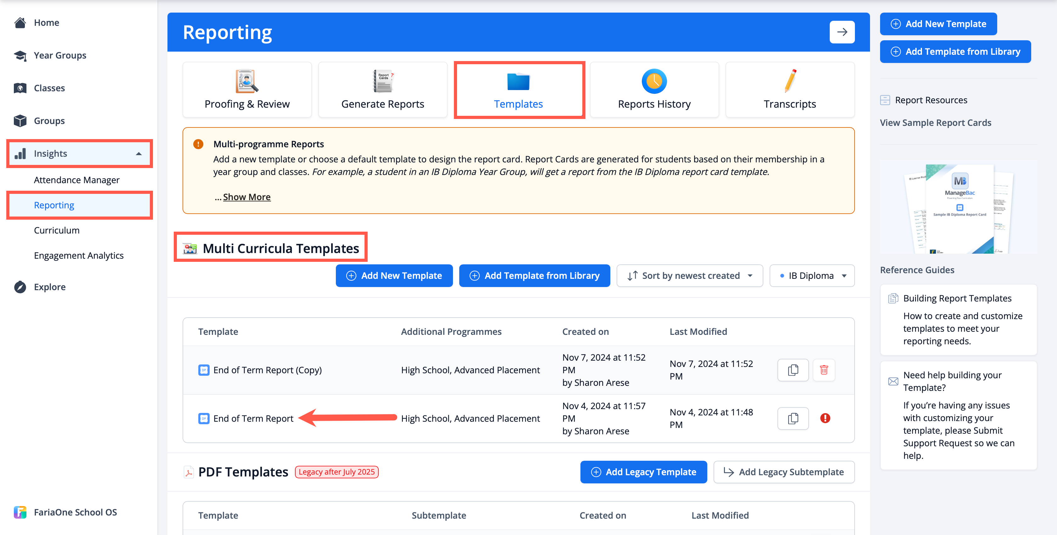 - Navigate to Insights > Reporting > Templates > Select Programme and MCR Template. Add the rubric that was included in Step 1 to the MCR template in the Assessment component.