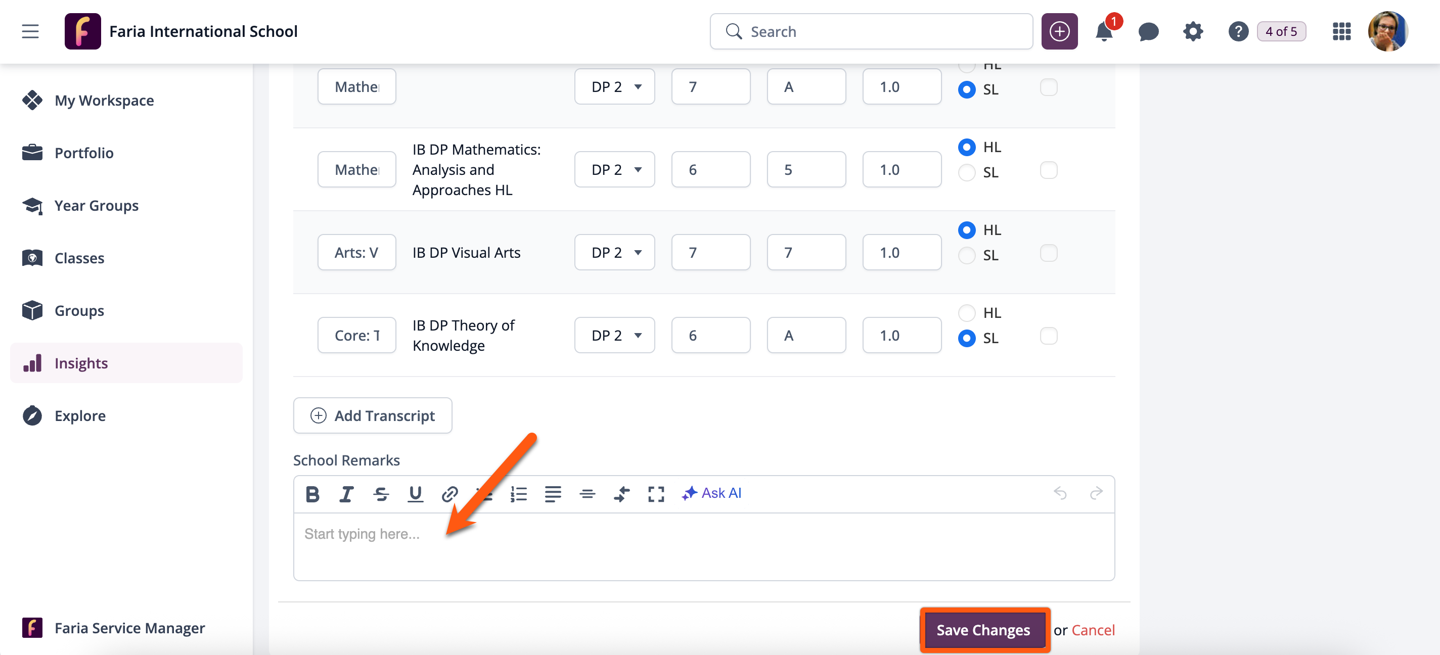 From there you can select the Edit icon > add text into the School Remarks text box > Save Changes.