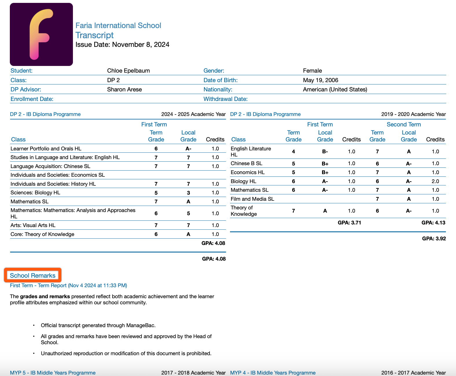 In the generated transcript, the entered text will appear under the “School Remarks” section.