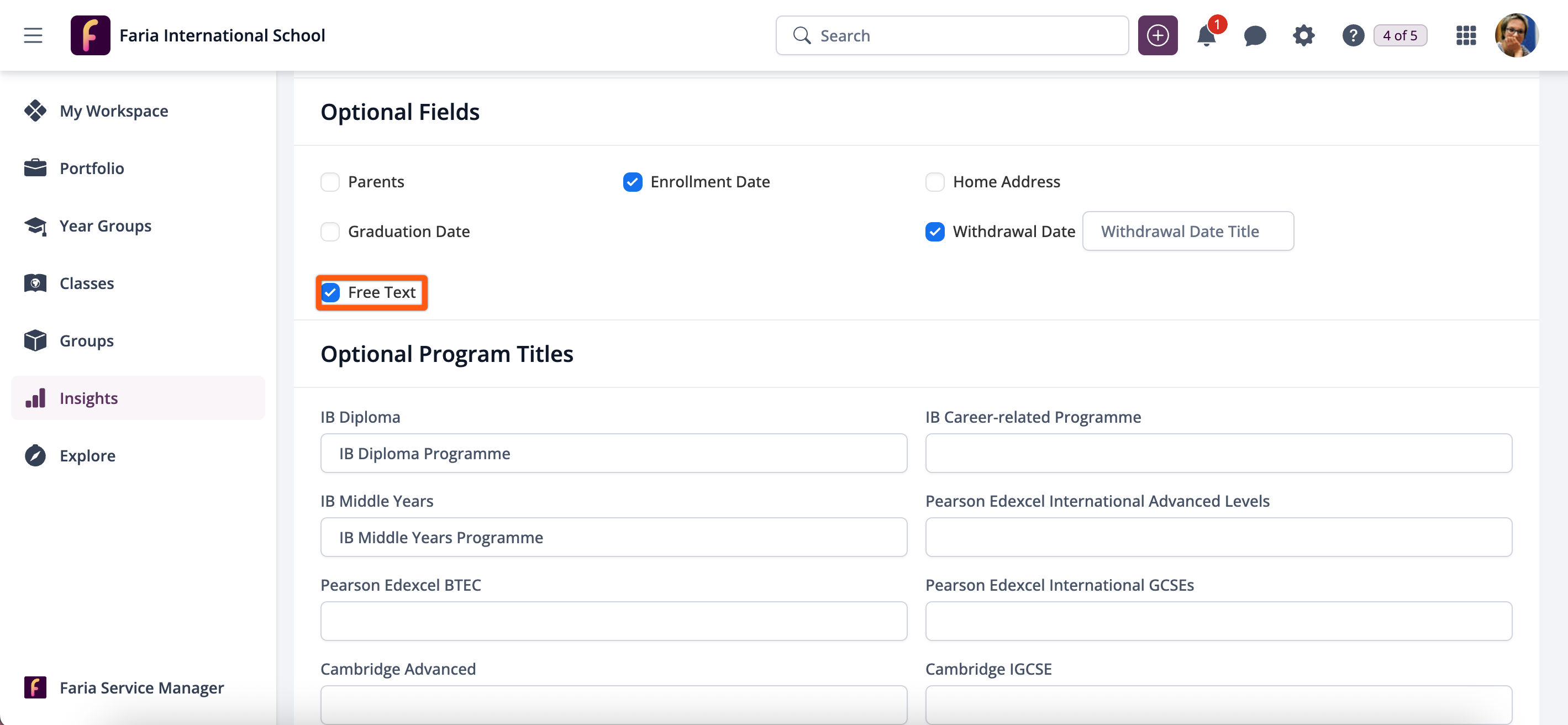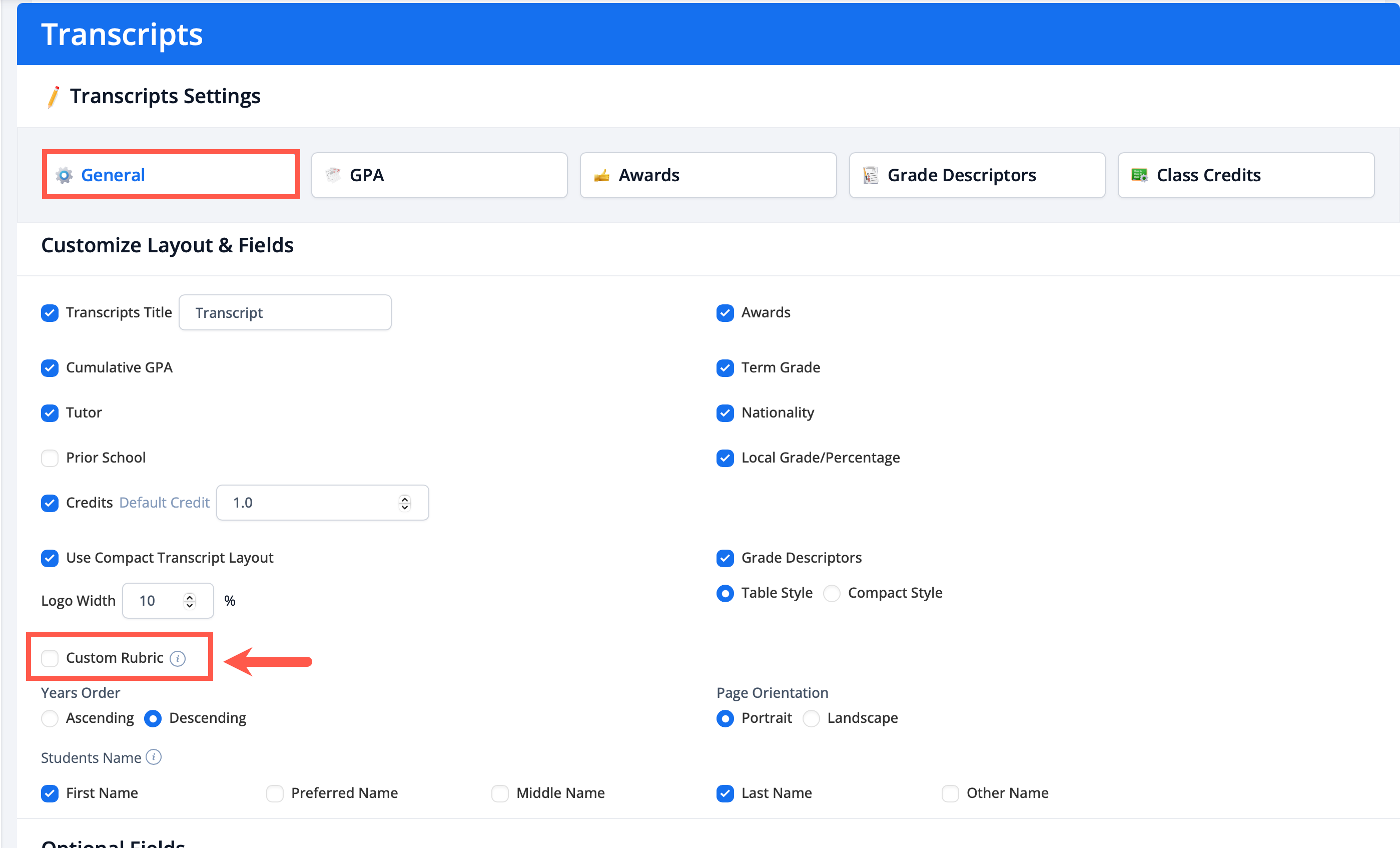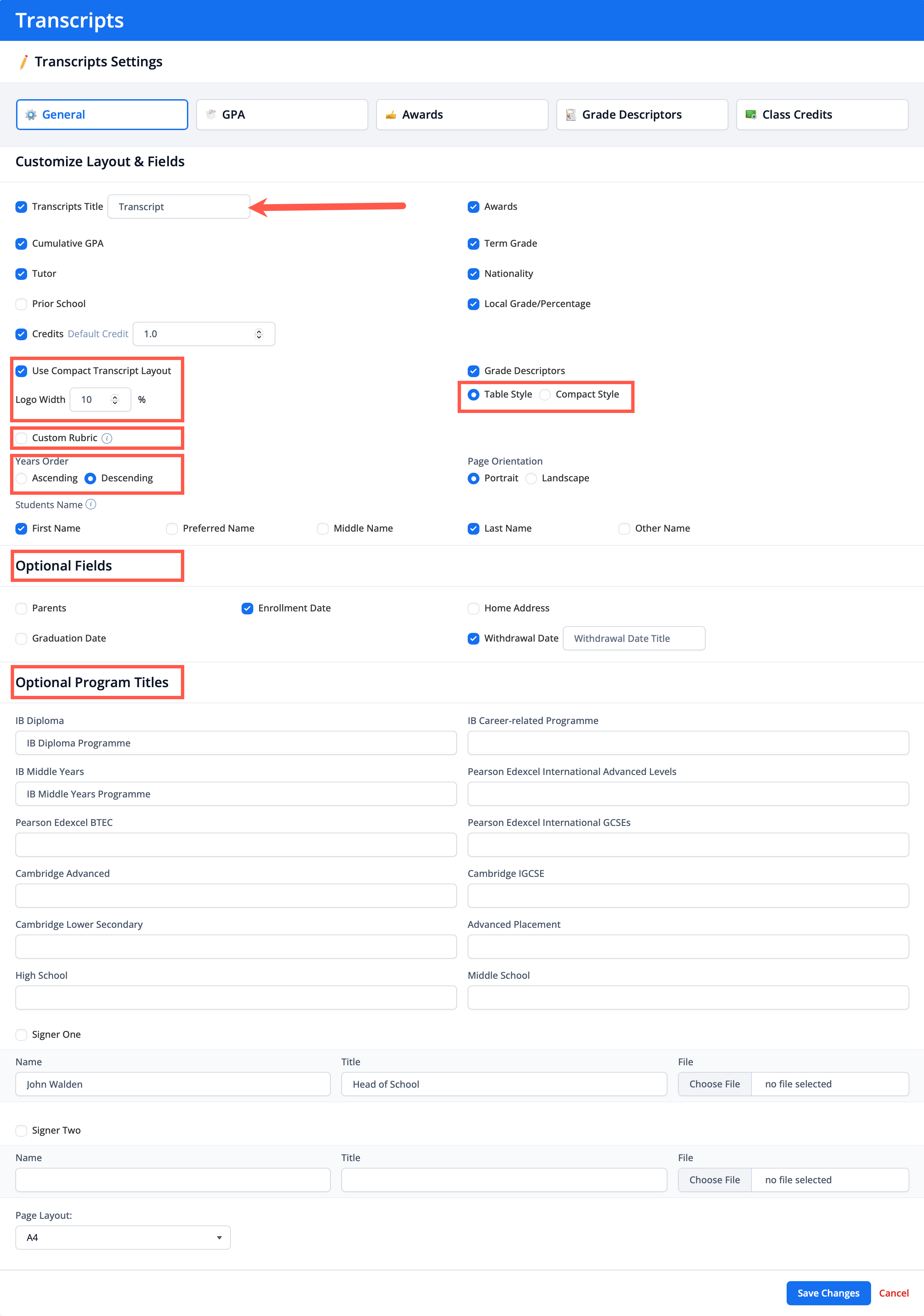 Here you can configure your Transcript Title, Years Order, Optional Fields, and where you can enable Compact Transcript Layout (i.e. a 1 page transcript).