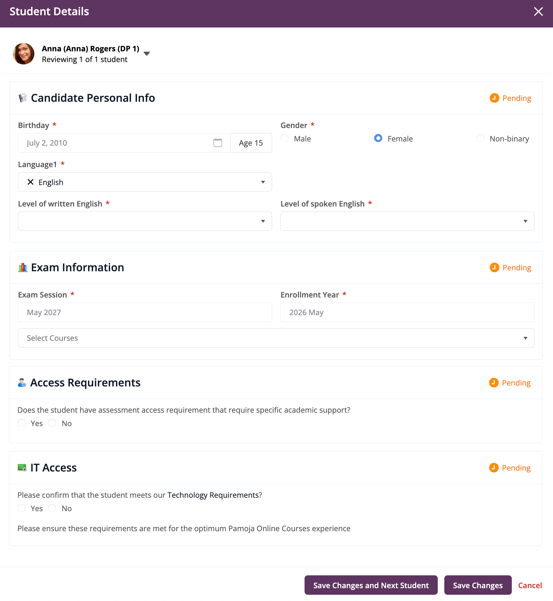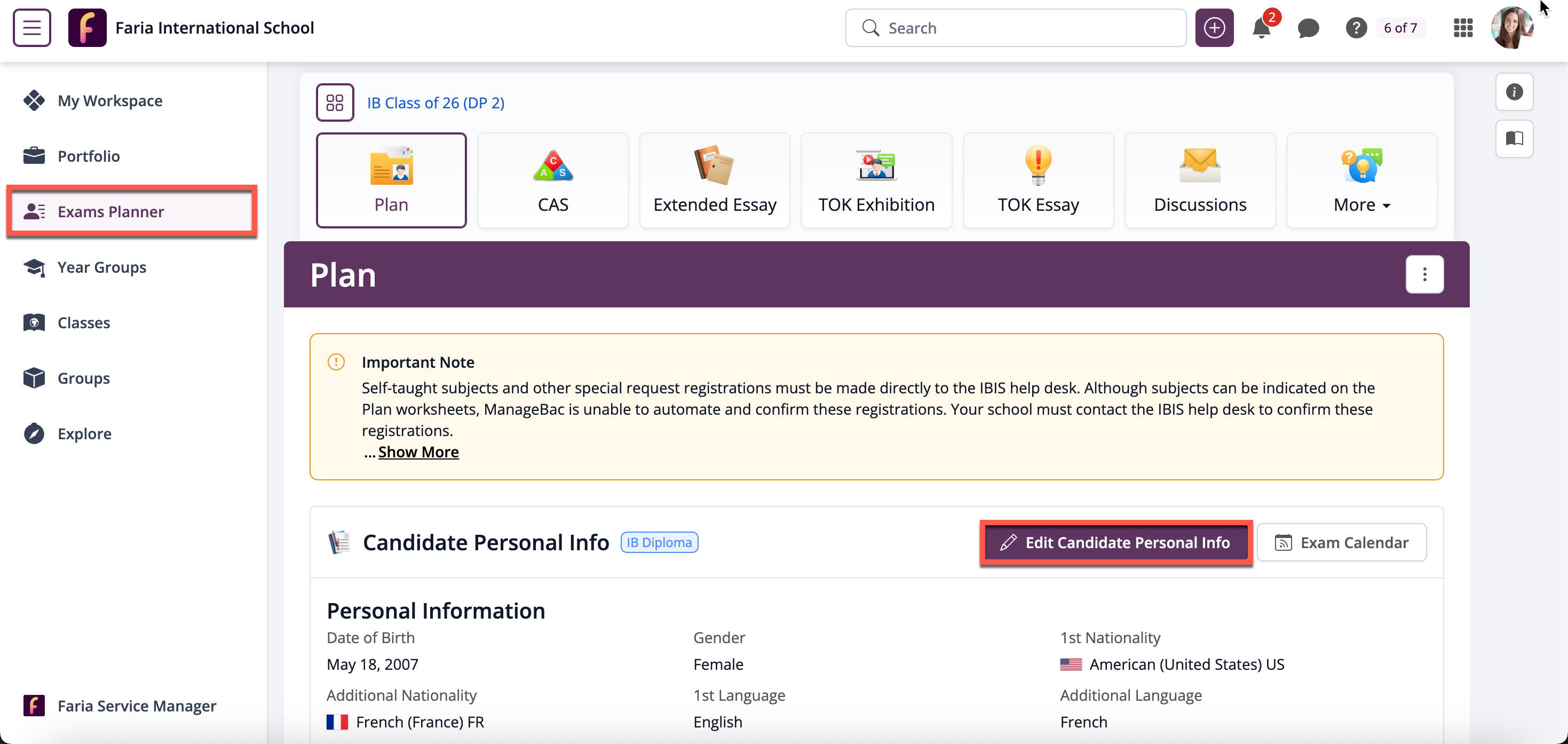 As an administrator, you can enter a student's IBIS Personal Code. This code is used to identify any students previously registered as anticipated candidates or in the MYP. You can also enter the student's Candidate Session Number. Students are not able to edit these fields.