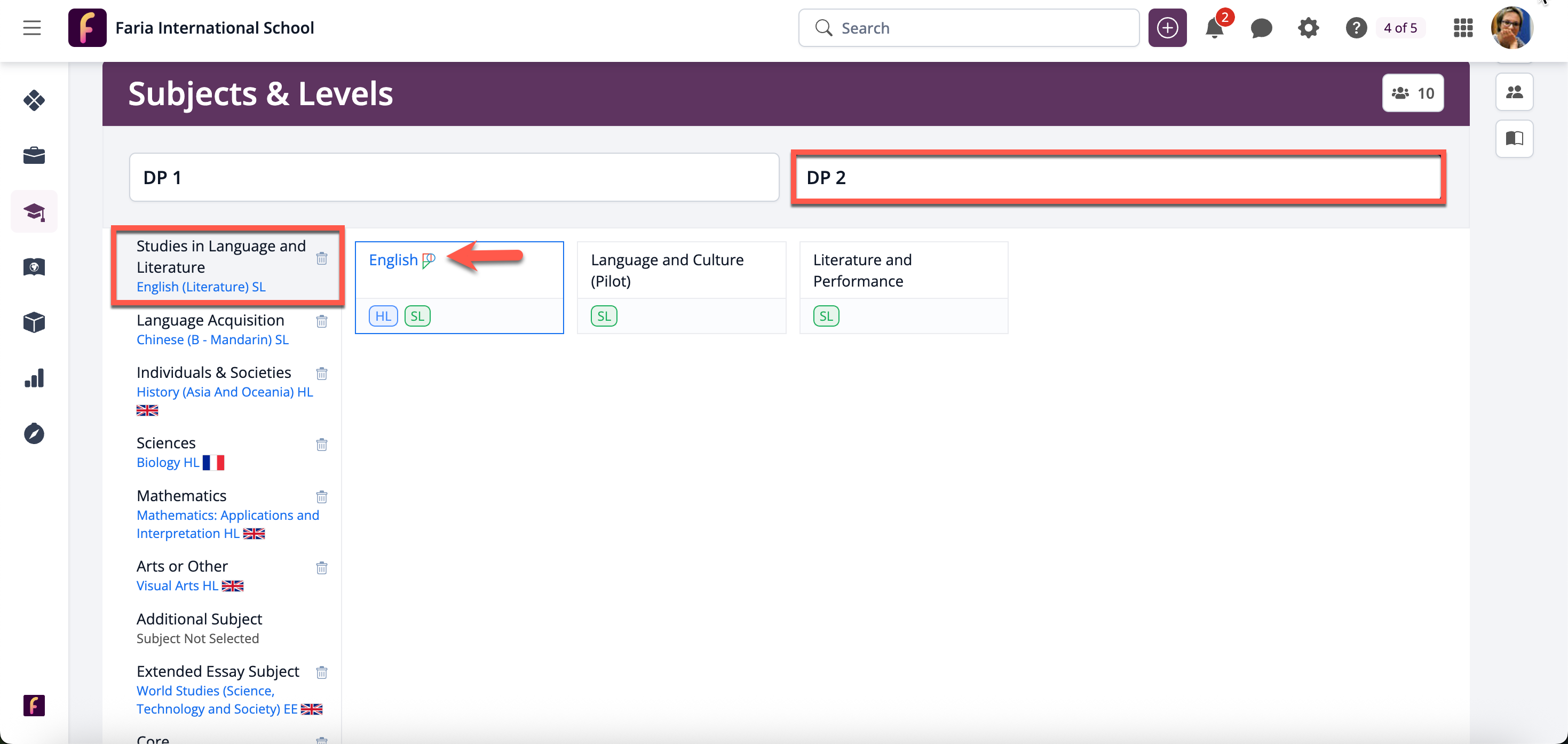 If the student is taking two Language A exams, the second language A subject can be selected by clicking Add New Subject and selecting “Second Language & Literature”.