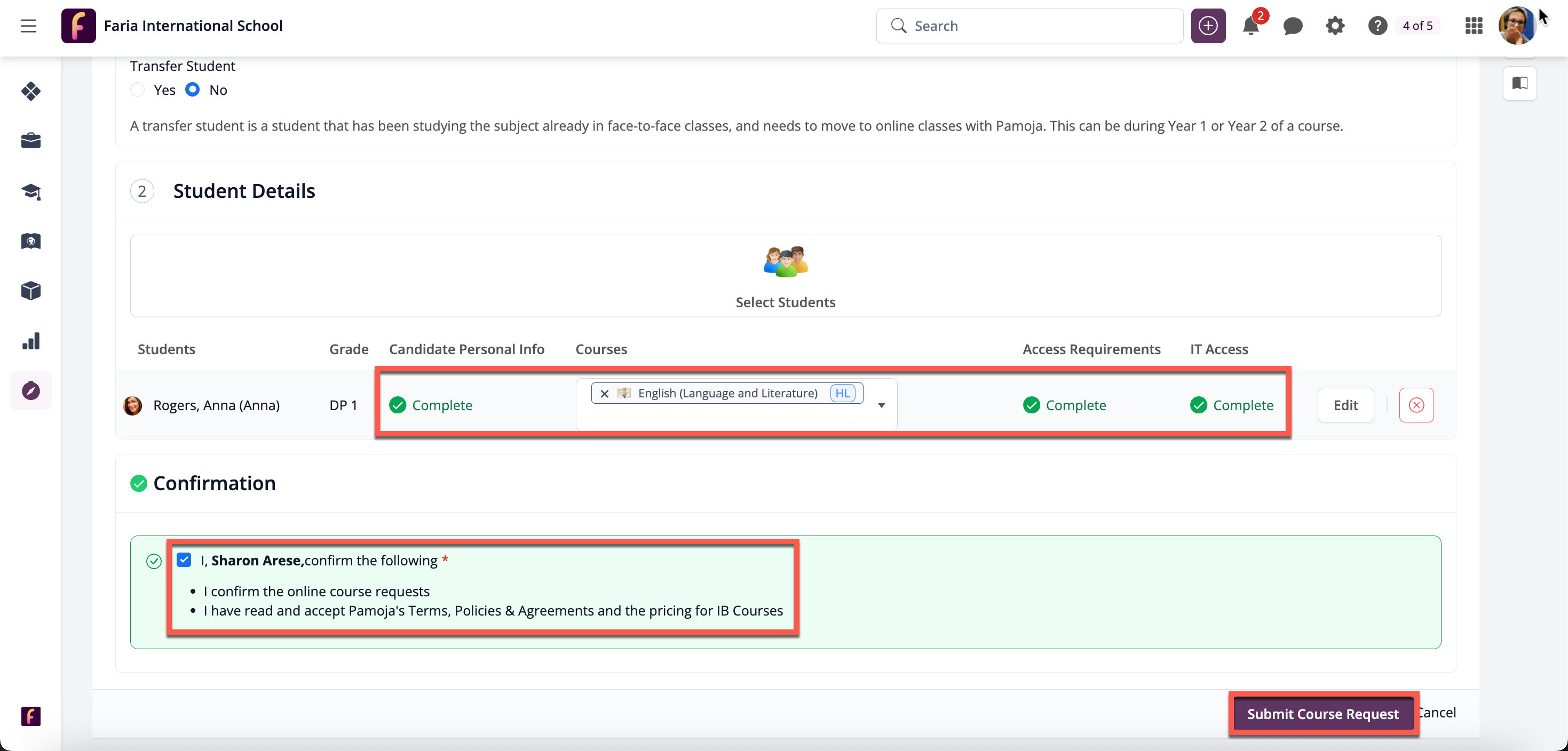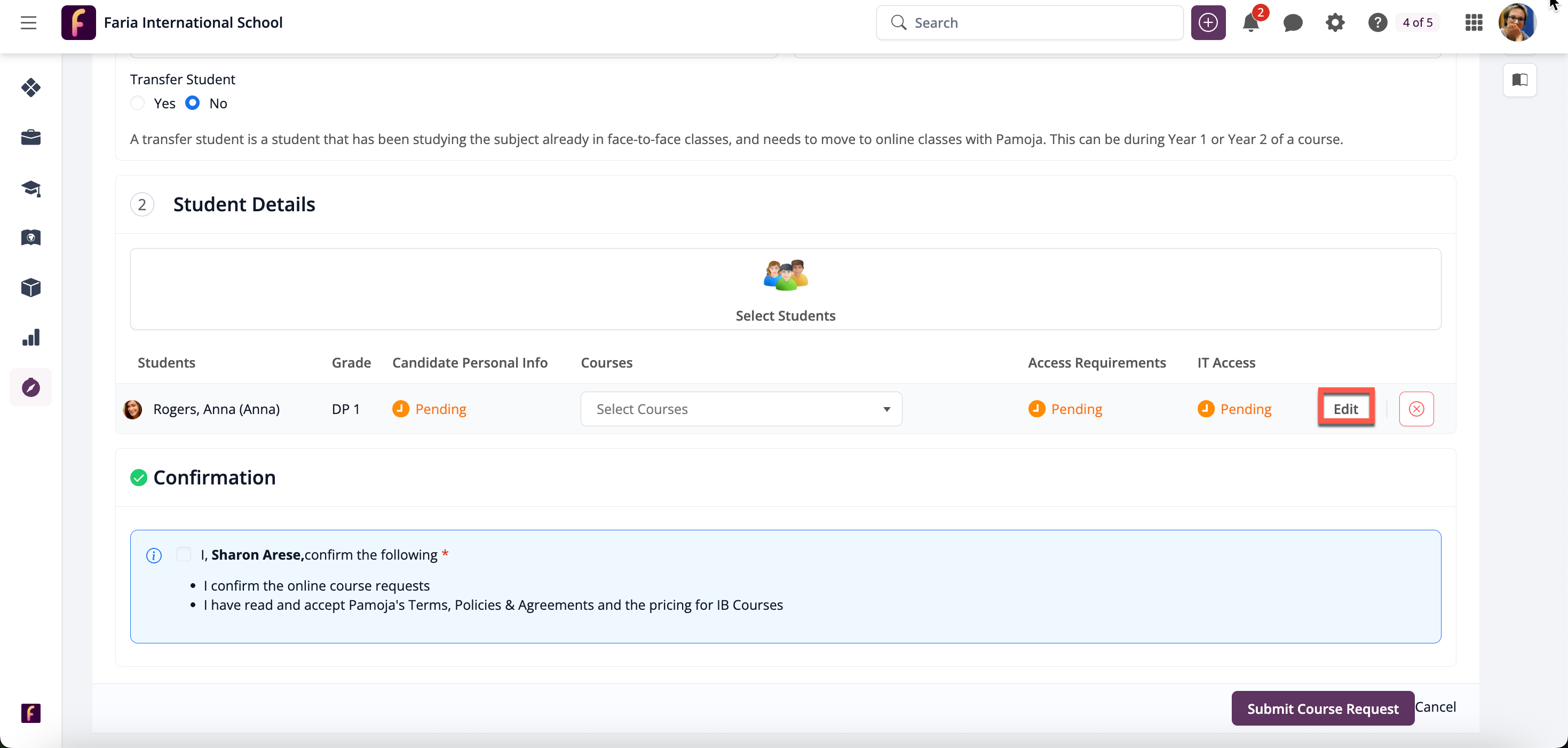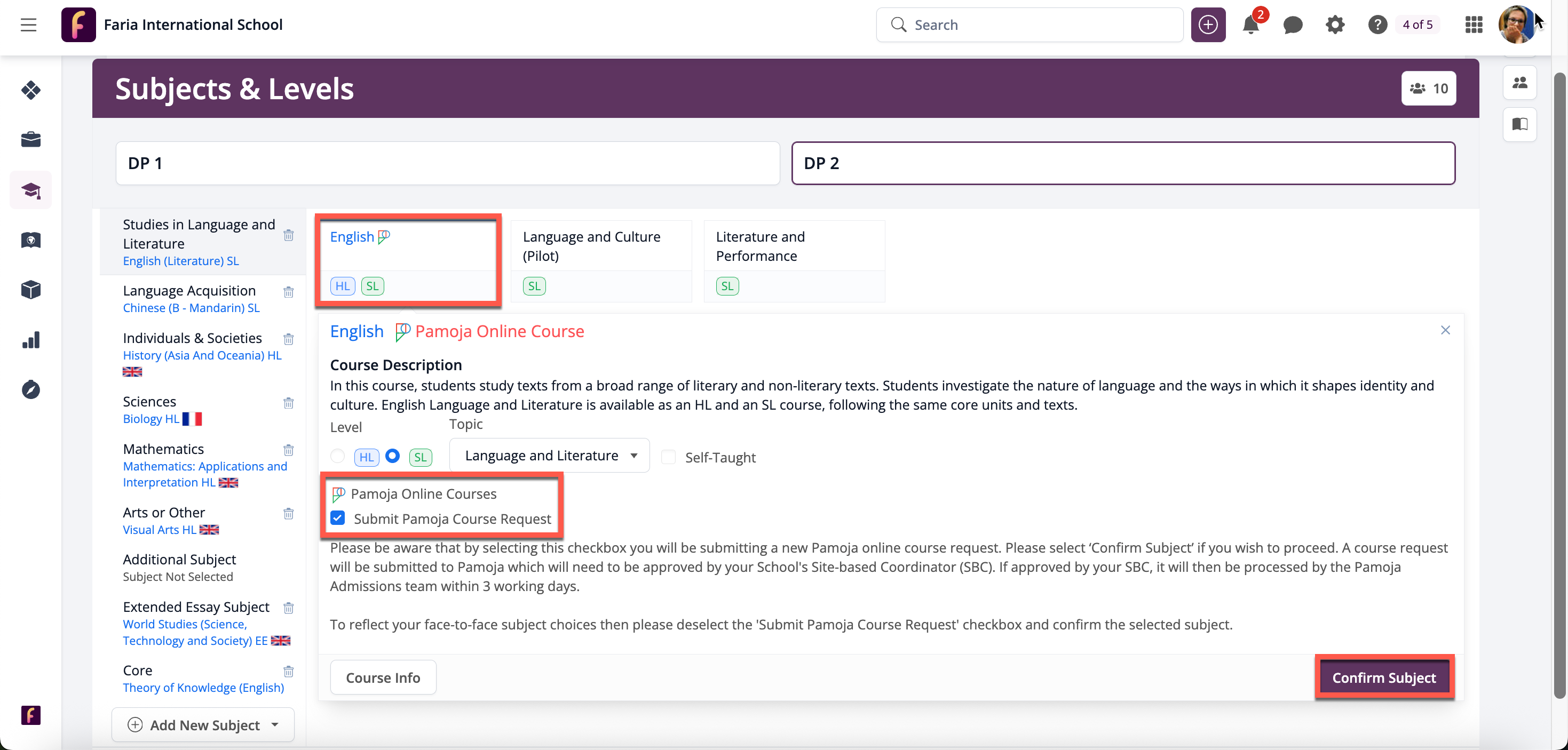 Teachers (Pamoja Site-Based Coordinators) may click on the course and tick Submit Pamoja Course Request to indicate this course will be taught to the student through Pamoja, followed by Level and the 'Submit Pamoja Course Request. Then, click Confirm Subject