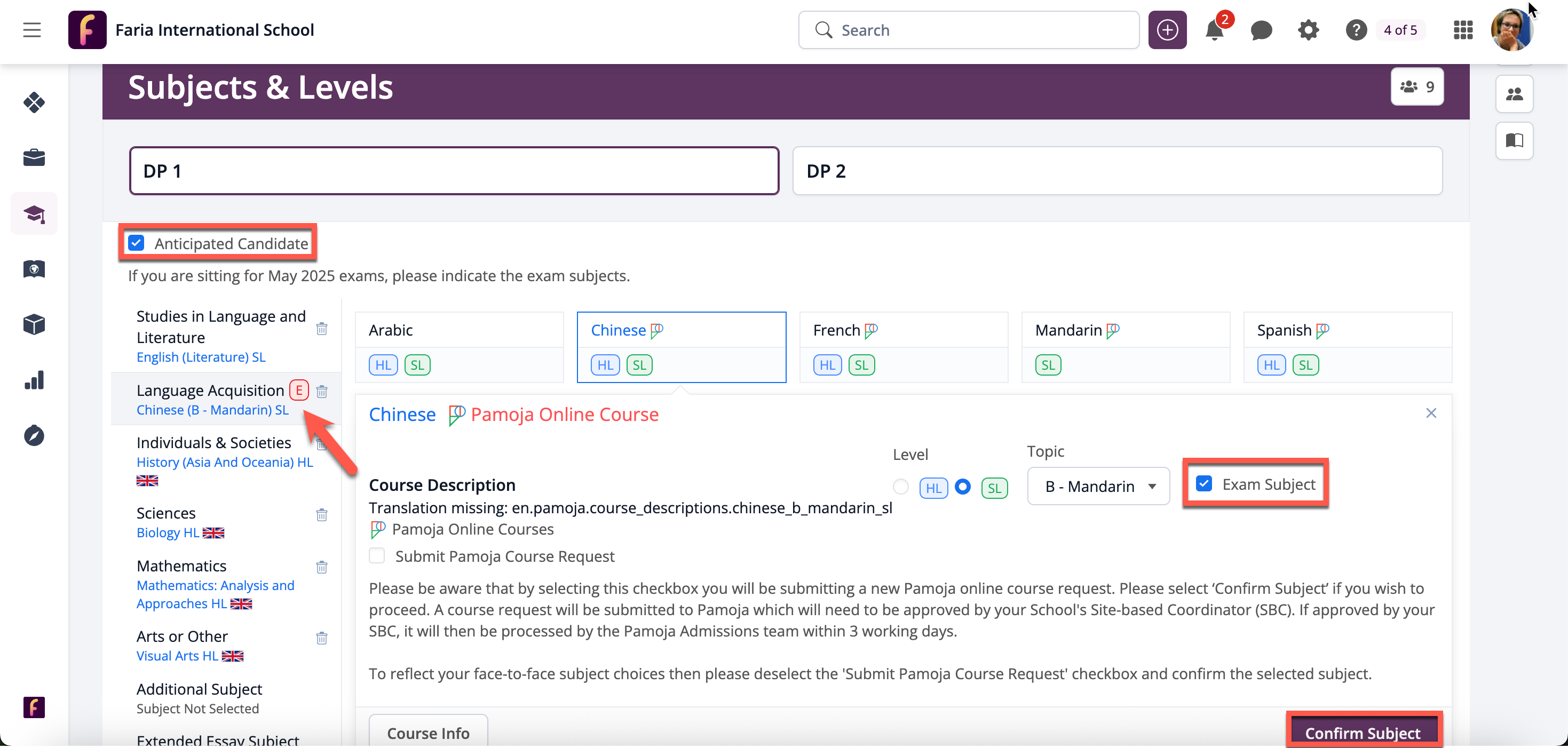 For students who are sitting exams in their DP 1 year, please tick the Anticipated Candidate checkbox via DP 1. Select the subject & levels for the exam which will be anticipated, tick the Exam Subject checkbox and Confirm Subject.