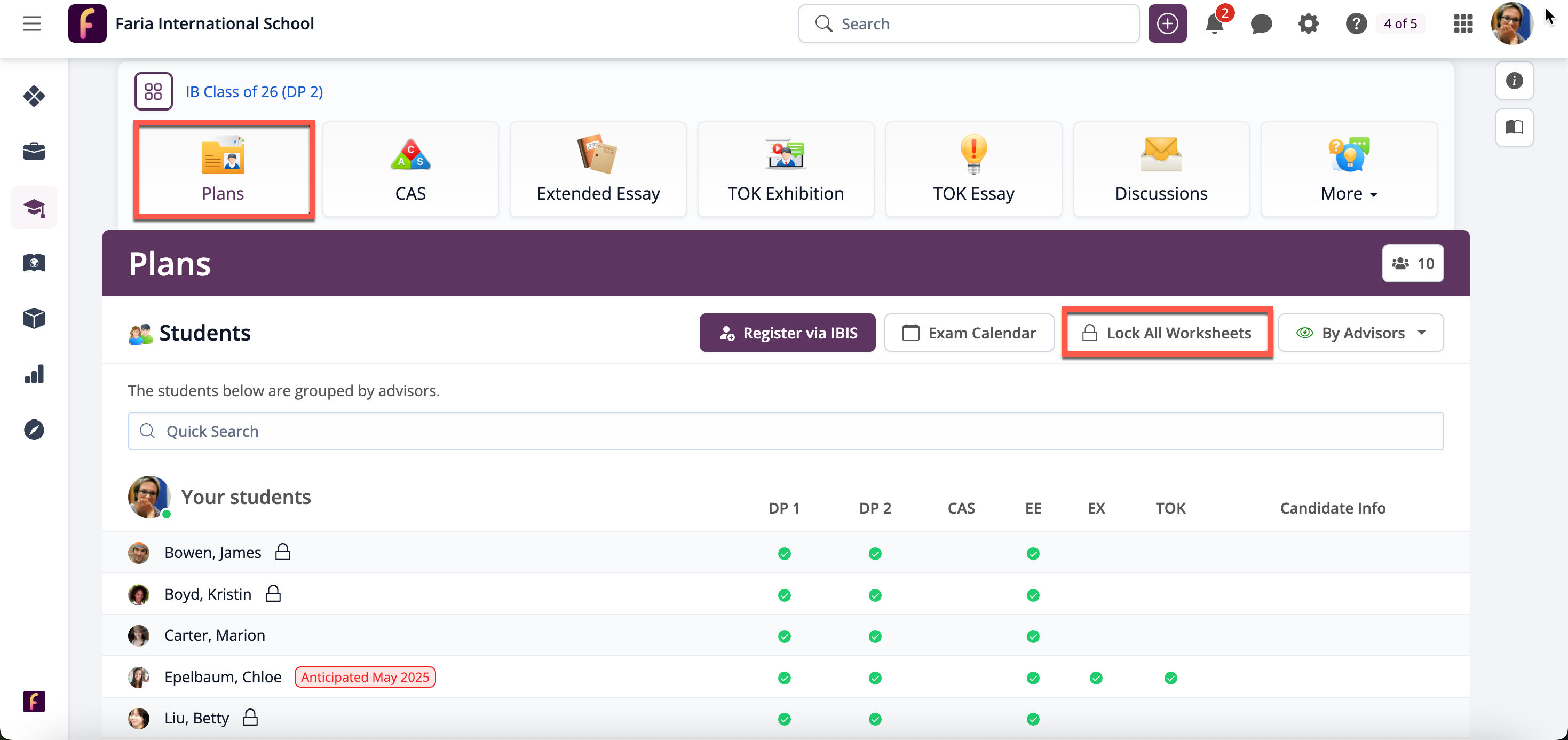 Click Unlock All Worksheets to allow students to complete their own Plans worksheets, or Lock All Worksheets to allow students to view but not edit their worksheets. You can see if worksheets are locked or unlocked using the lock icon next to each student's name. If you click on a name, you will be shown that student's Diploma plan.