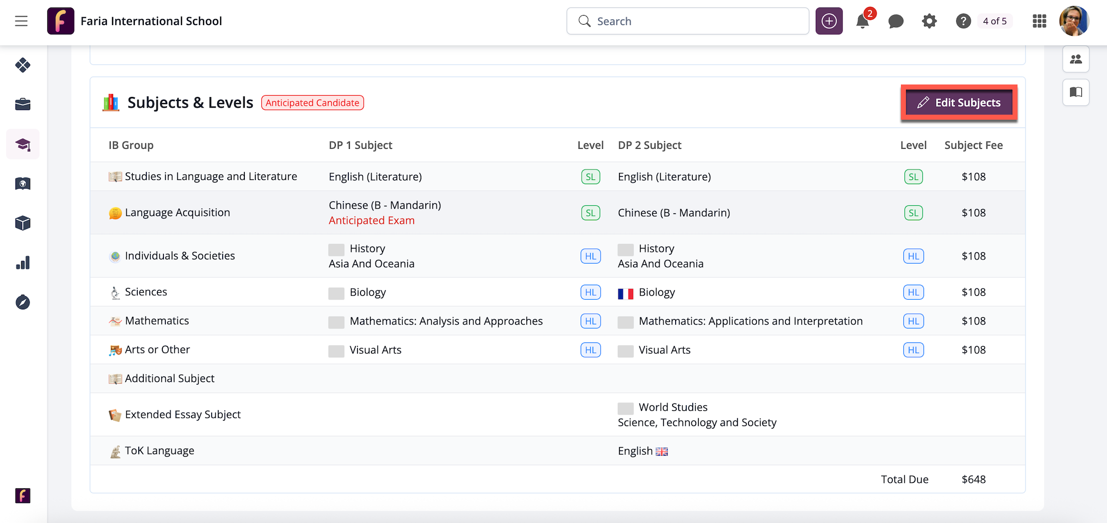 Anticipated exam candidates should also have their exam subjects selected. Click the checkbox next to Anticipated Candidate and then select the exam subjects, ensuring you select Exam Subject next to each course where an exam will be taken in Grade 11 or DP 1. After you click on Confirm Subject and then Save Changes, these will be indicated in the student's Subjects & Levels.