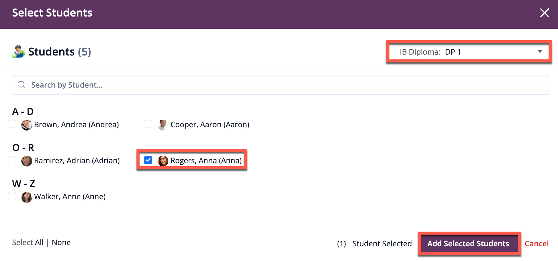Once the students are selected, you can then click Add Selected Students