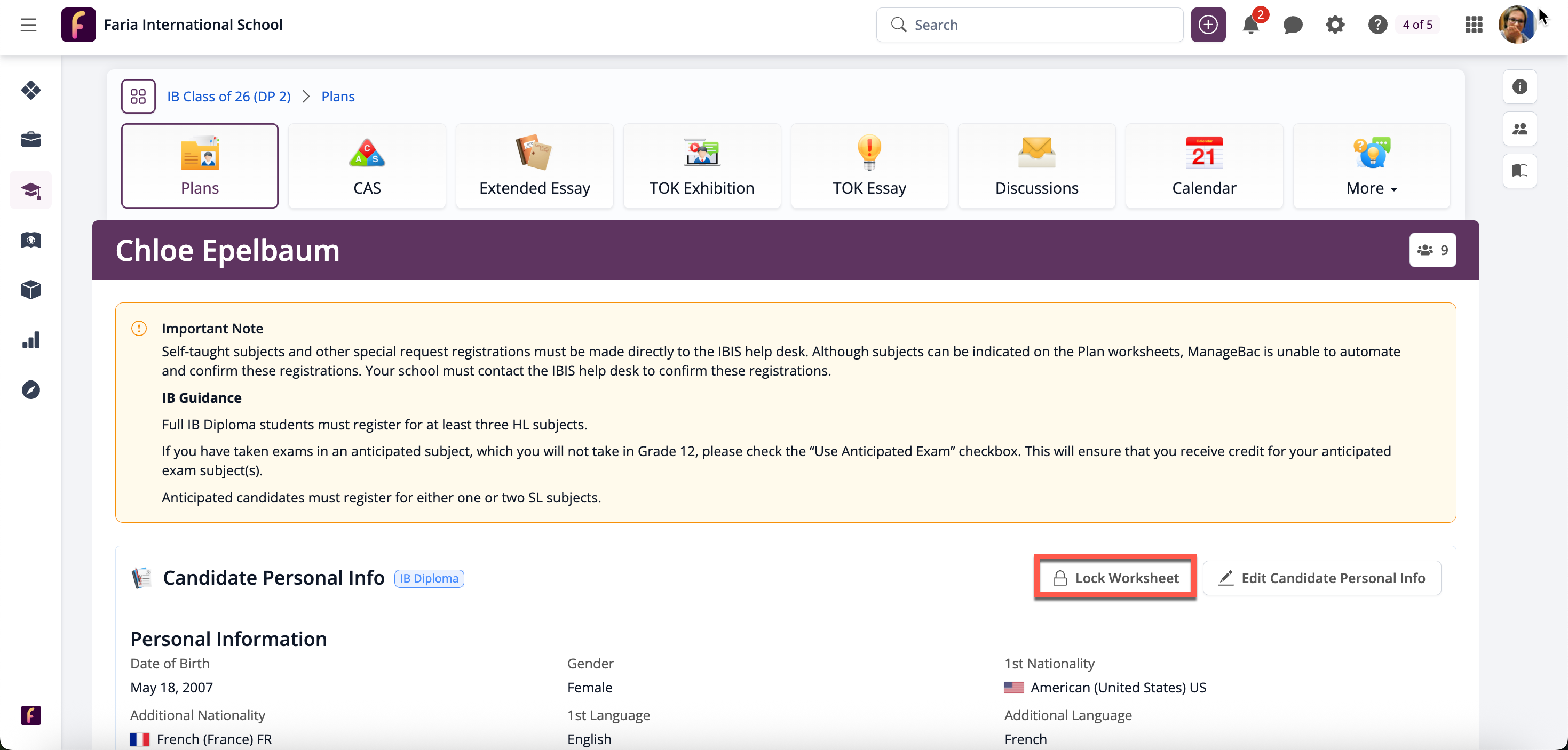 After reviewing a student's plan worksheet, you can click Lock Worksheet, which will restrict the student's ability to make further edits. You can still make edits by clicking the Edit Candidate Personal Information or Edit Subjects