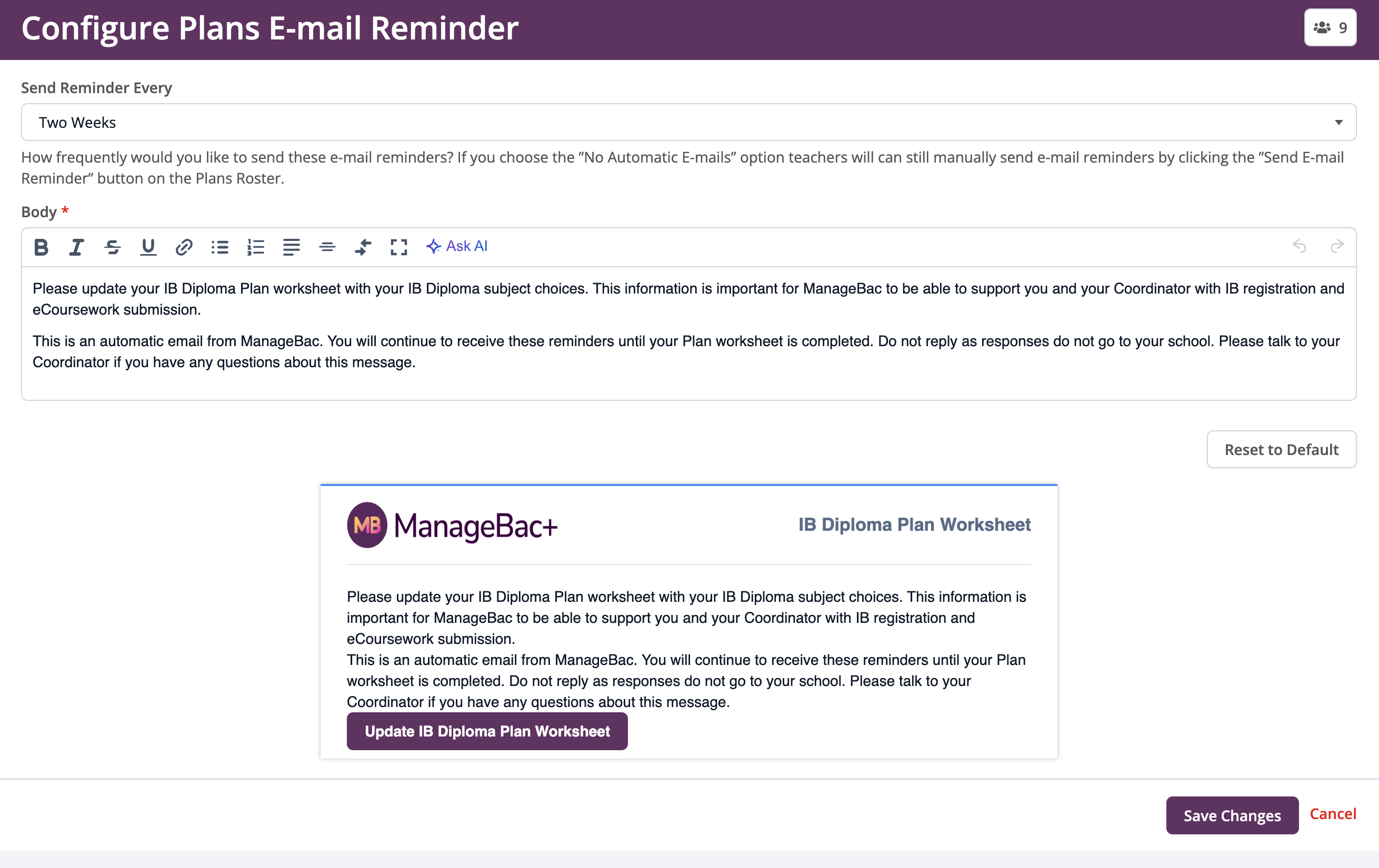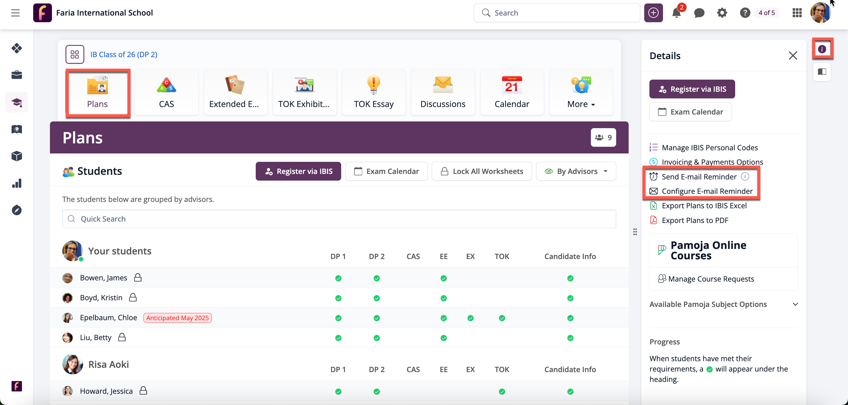 Via the Plans tab, click Send Plan Reminders to send reminders to students with incomplete plans worksheets.