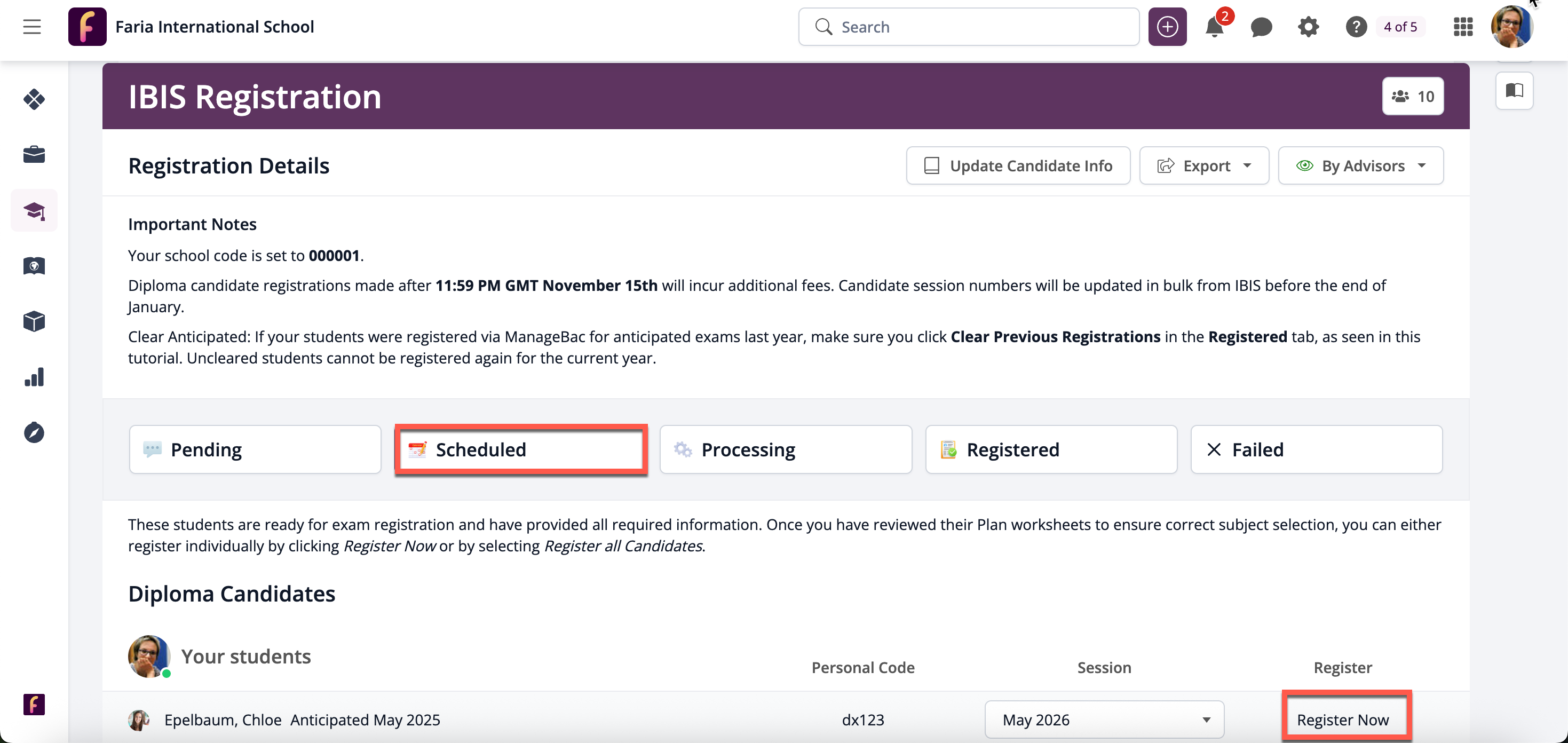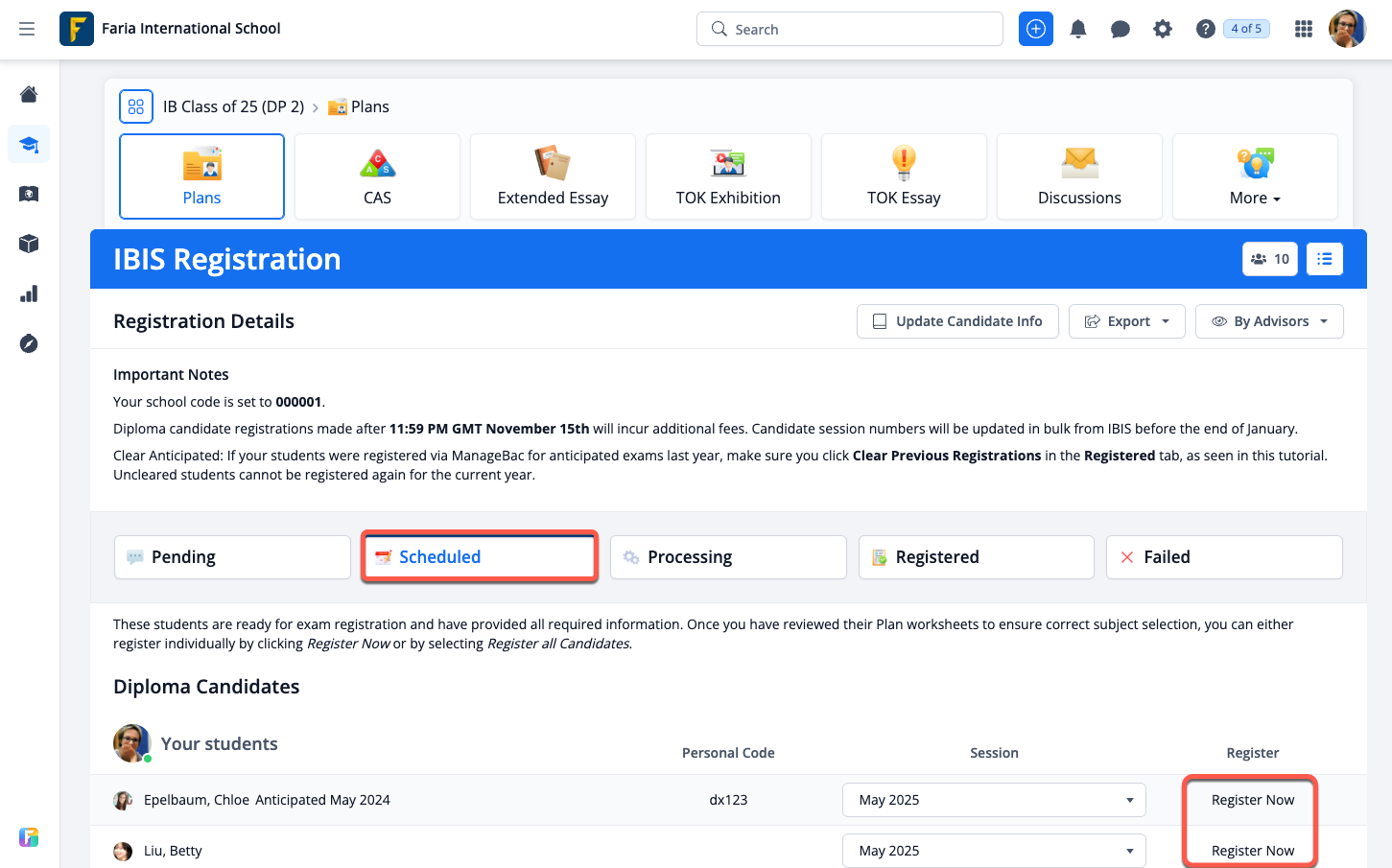 Candidate is already registered in IBIS and can not be registered again from ManageBac+.