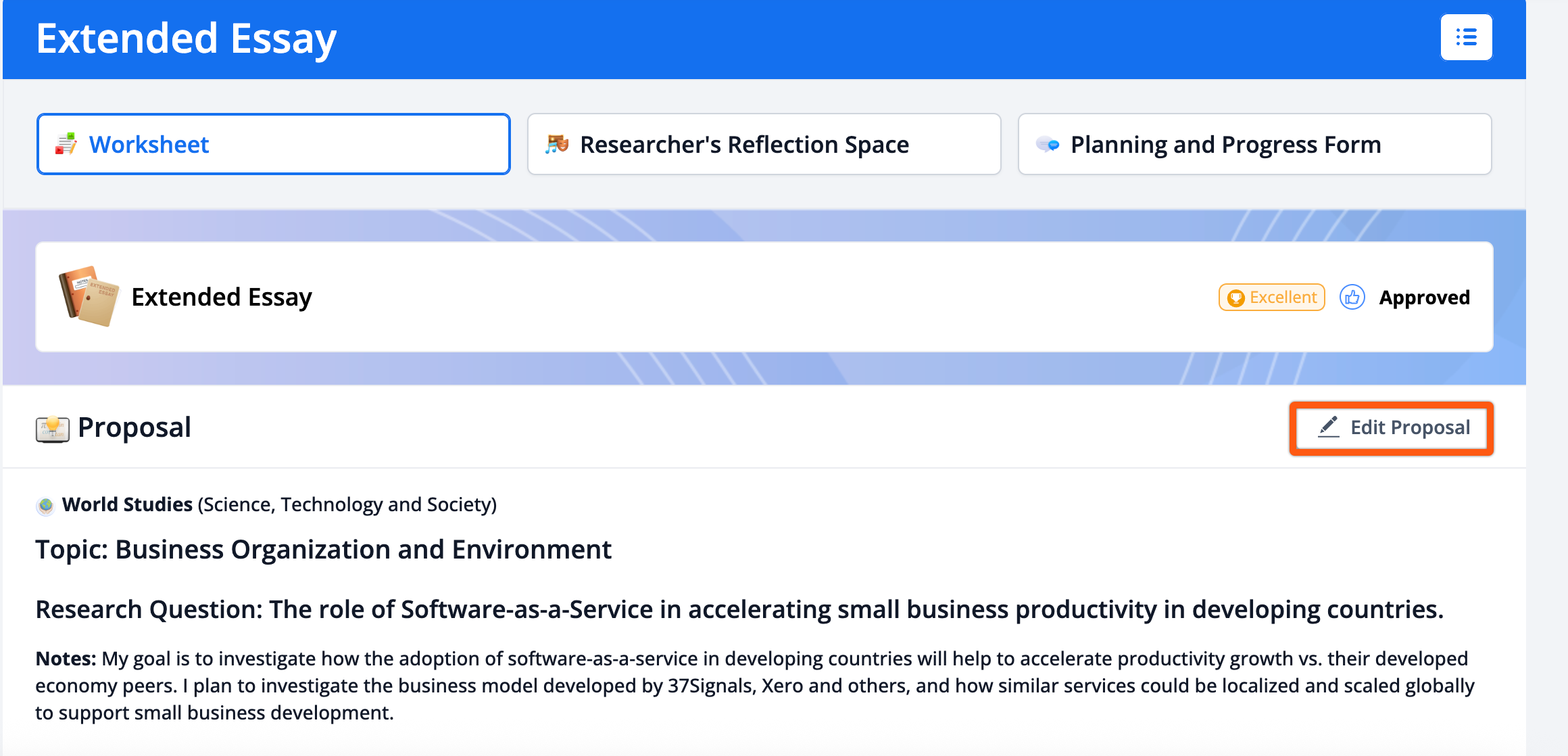 Make sure to enter your Subject, Topic, and Research Question, and select your Supervisor, if you have not yet been assigned. If you don't see your subject or EE supervisor on the list, you'll have to wait until your EE coordinator has added your supervisor to the system and configured the offered subjects. When you finish filling in all the relevant information, don't forget to Save Changes.