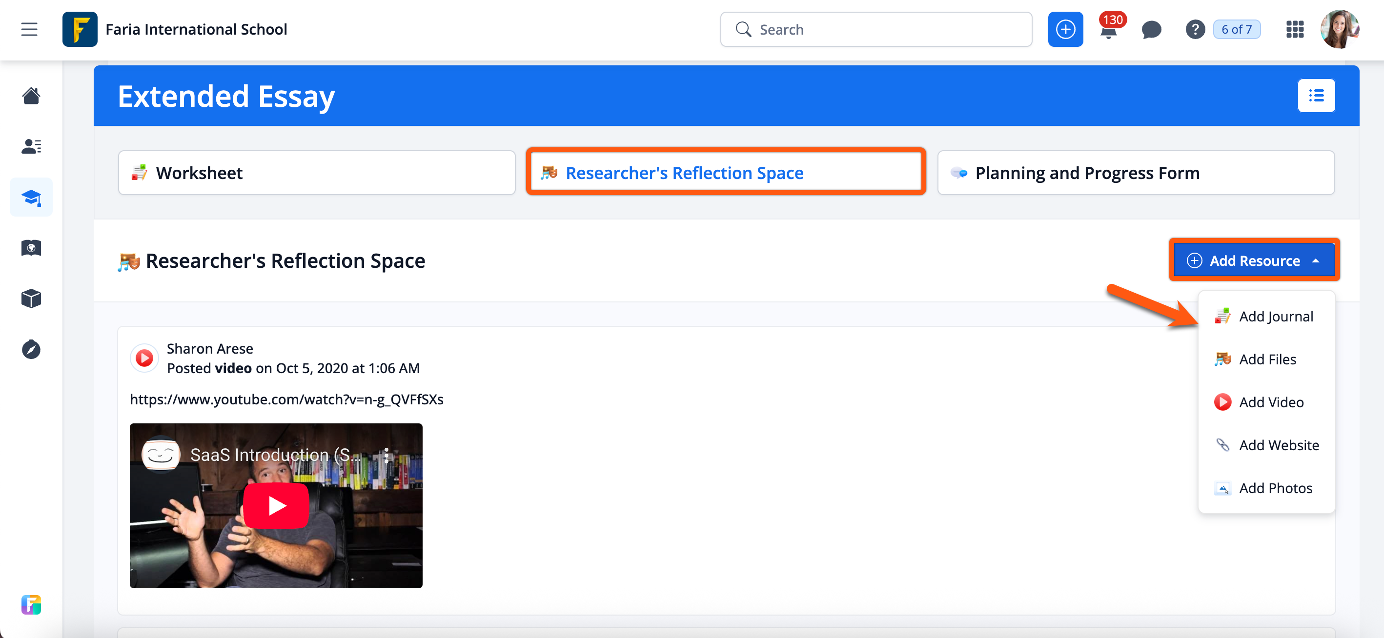 To add a new entry to your journal, click on the Add Resource. You can choose from a variety of mediums, including journal entries, attaching files, video links, website links, or adding photos.