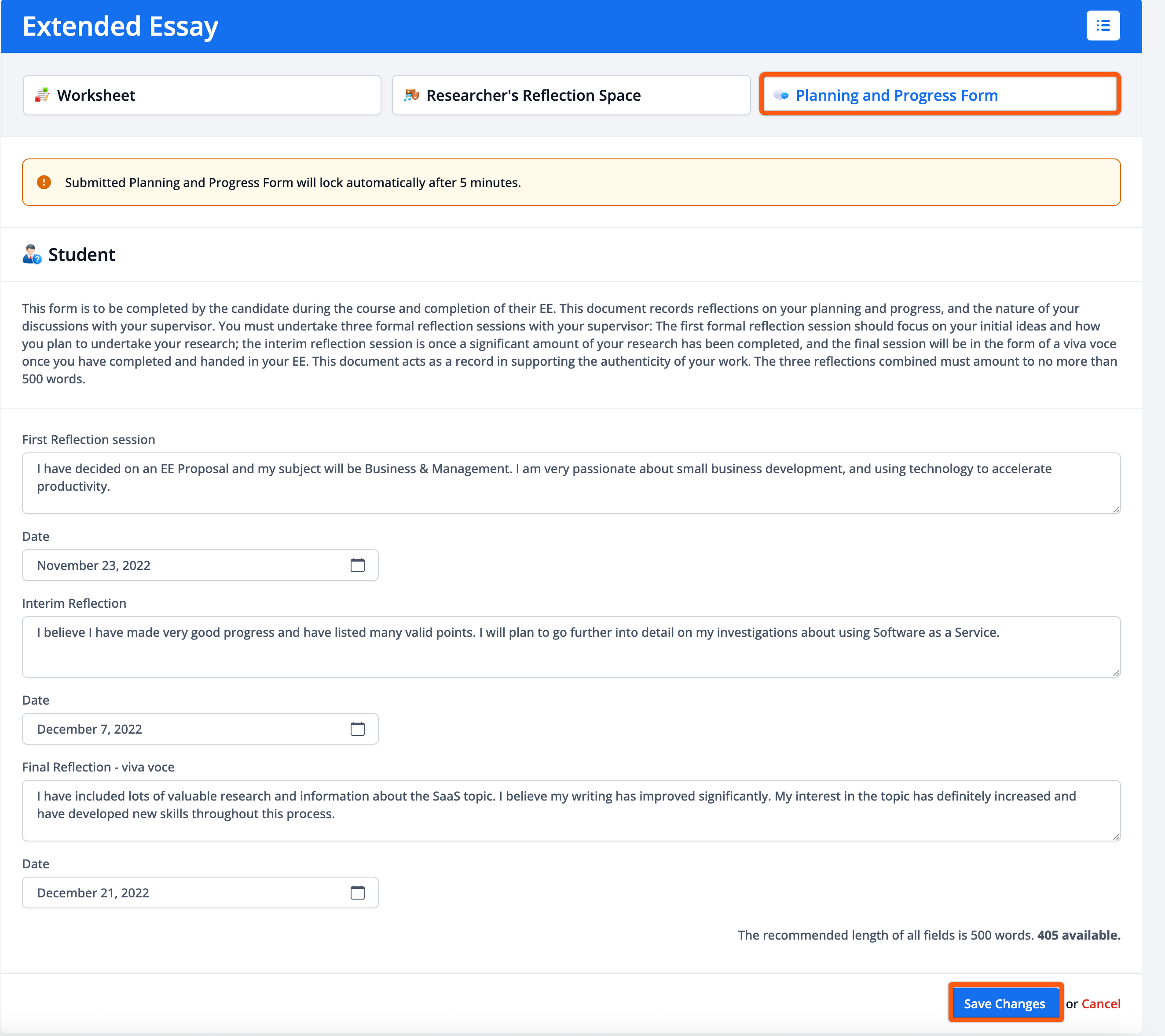 You can add new reflection sessions in the comment boxes, and add the IB DP year and date of each by clicking on the calendar icon in the Date box. The reflection box will lock 5 minutes after you have finished entering text and clicked Save Changes.