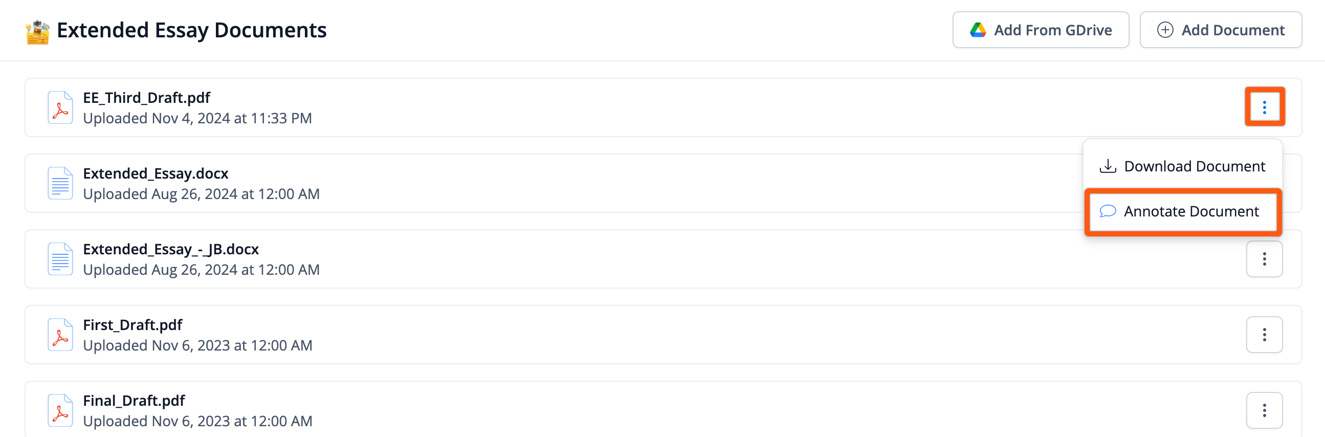 Uploaded documents can be annotated by either yourself or your Supervisor via the three-dot icon > Annotate Document.