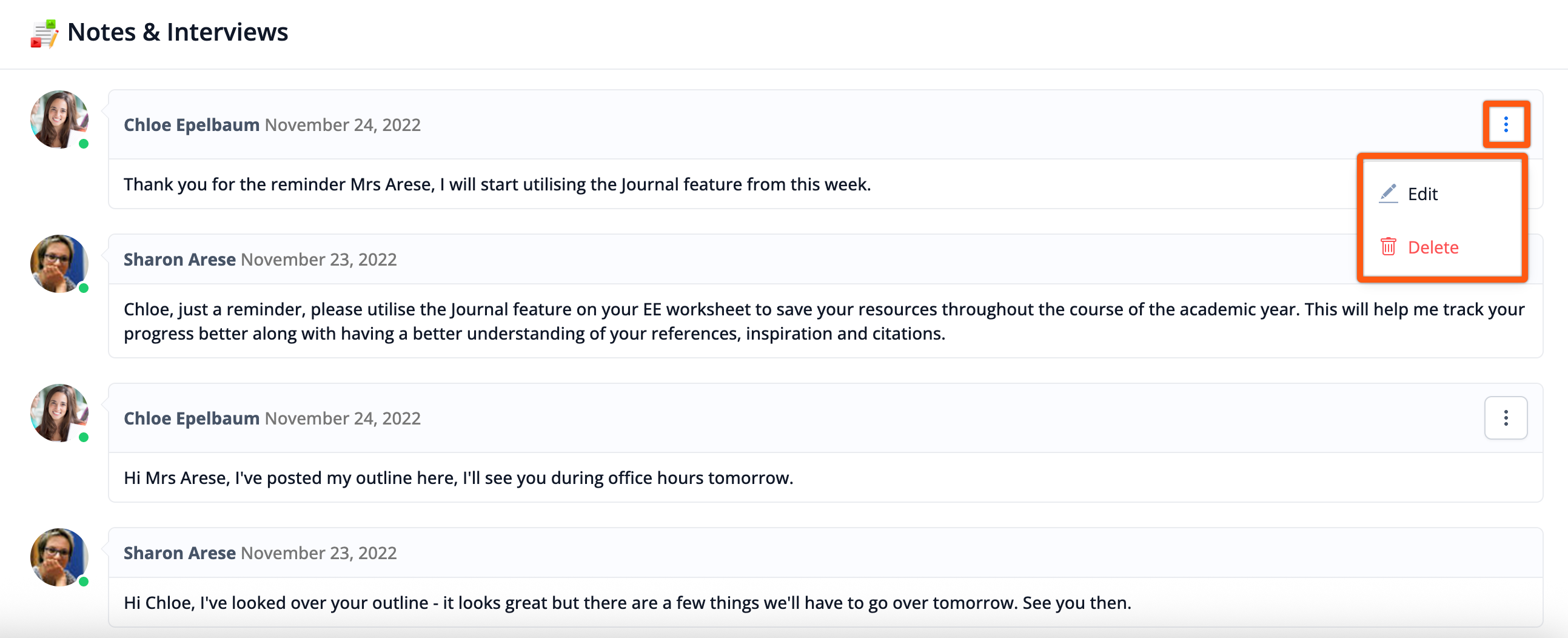 Under Notes & Interviews, you can leave messages for your EE supervisor. This is ideal for posting questions and scheduling meetings.