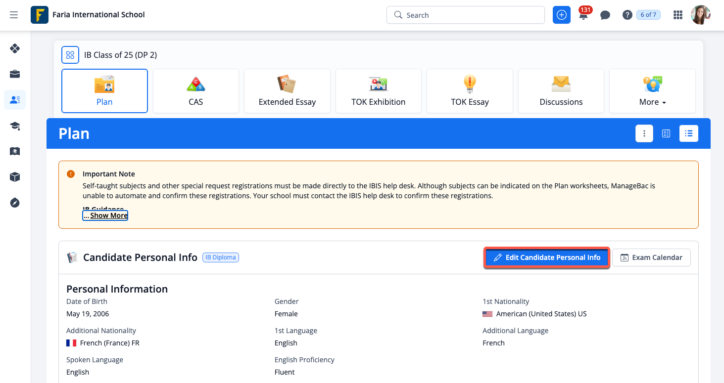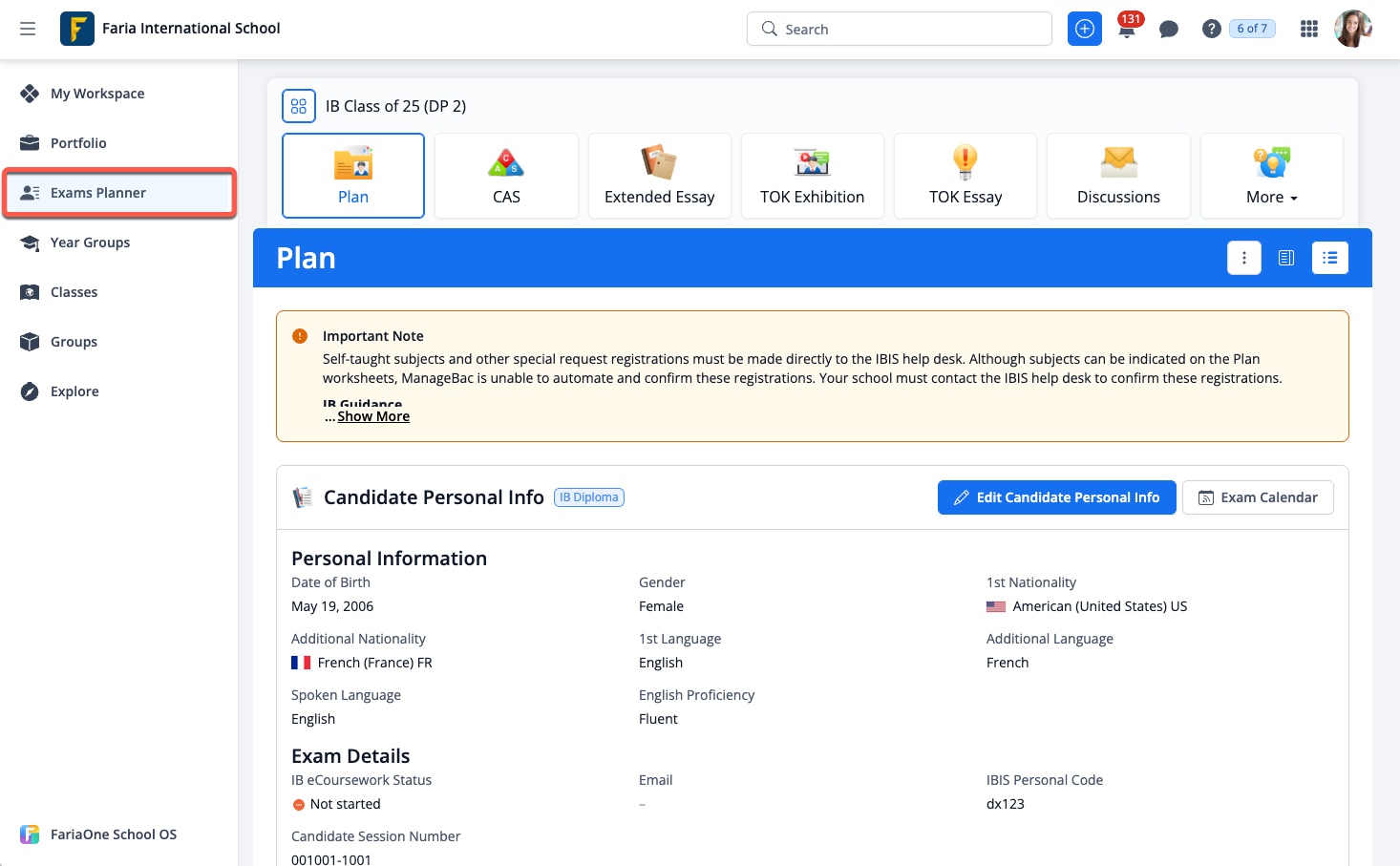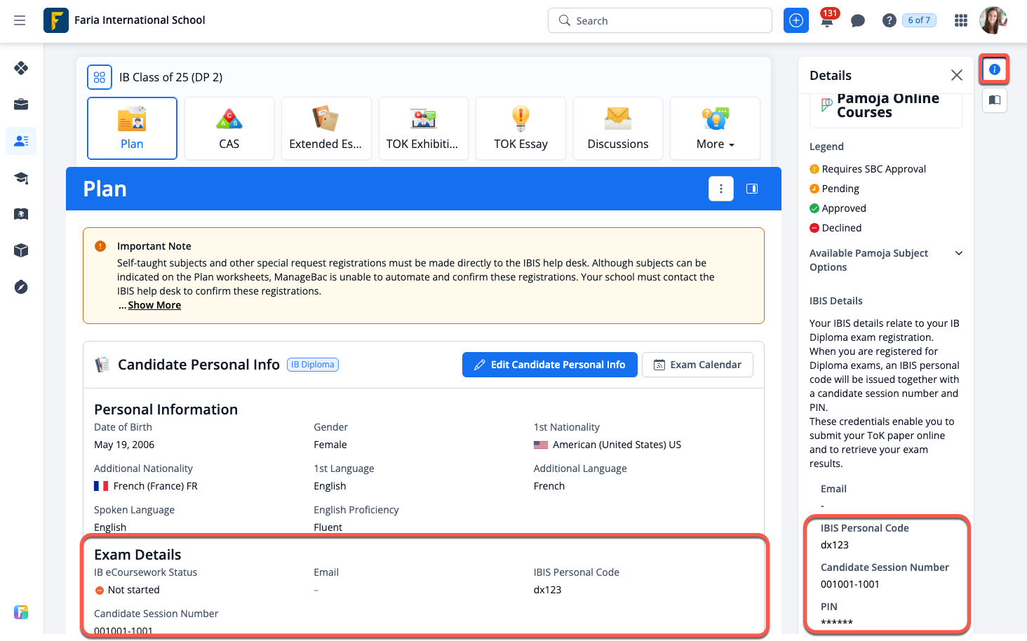 If your IB coordinator has added your personal code, candidate session number and/or IBIS pin to your ManageBac+ Plan worksheet, you can find this information on the right navigation panel or in the Candidate Personal Information section. These credentials enable you to retrieve exam results.