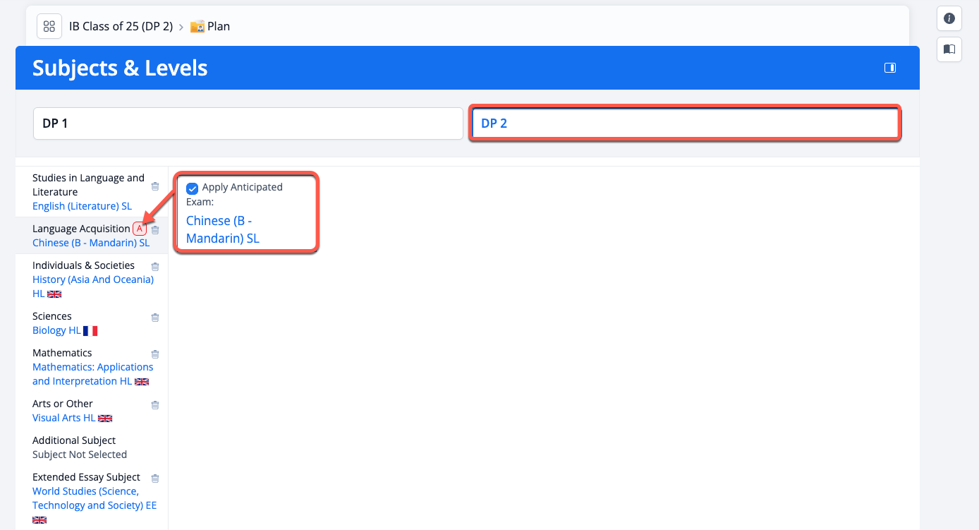 On your Grade 12 worksheet, the DP 2 tab, you must either check to Apply Anticipated Exam subjects or select a new subject and level for your final Diploma exams. Ensure to click Save Changes after.