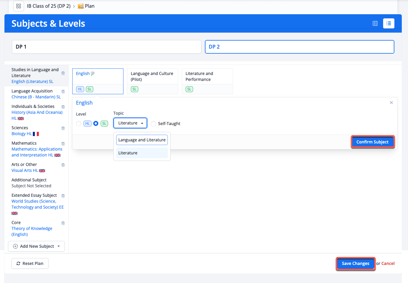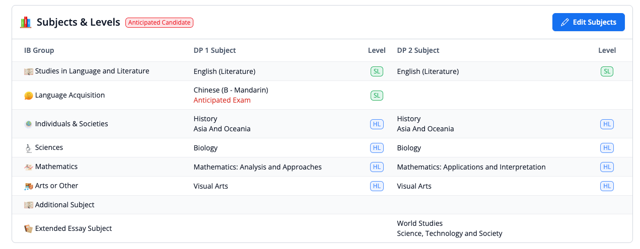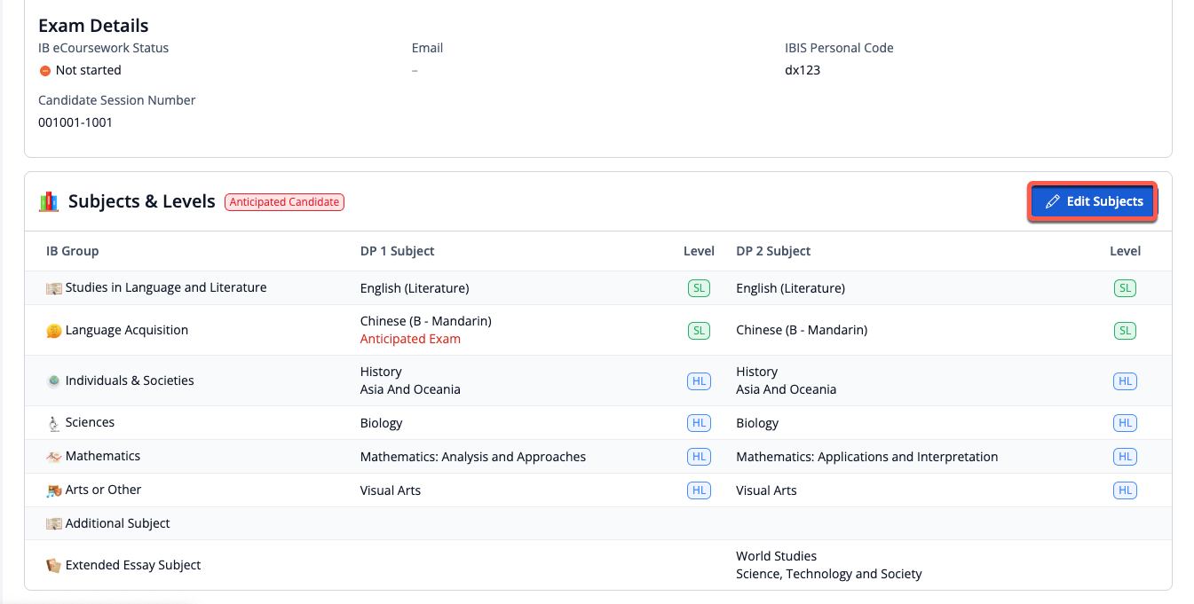Click Edit next to Subjects & Levels. Use the subject menus to select the appropriate subjects and levels (HL or SL) for each group, then click Confirm Subject. Once you're finished selecting your subjects for both Grade 11 or 12, click Save Changes. Your Grade 12 subjects will be used for your Diploma exam registration.