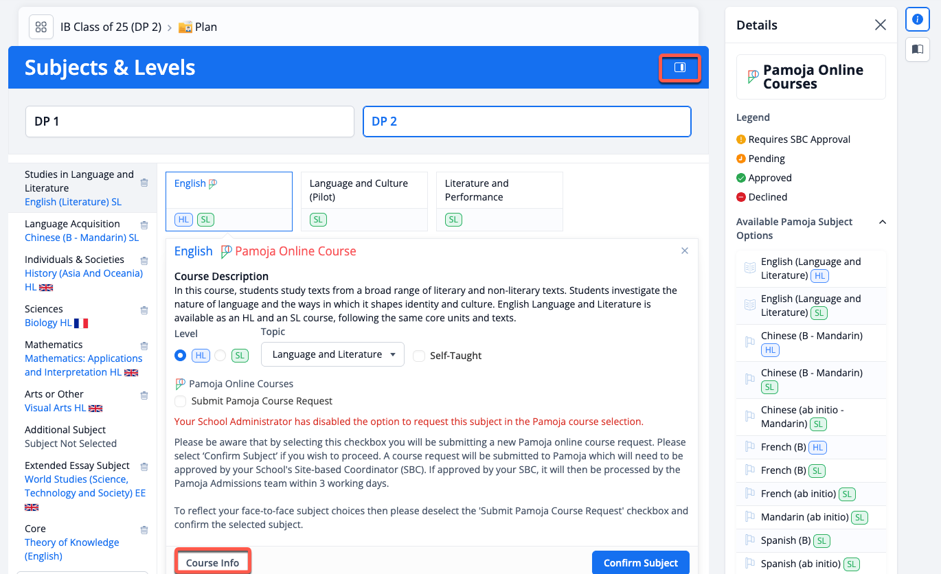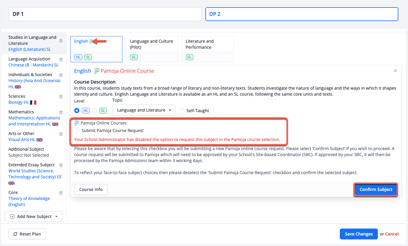 If your school has enabled Pamoja Online Courses, you will see a Pamoja symbol next to each course offered by Pamoja. When clicking on the course, you will see the option to Submit Pamoja Course Request. Tick this box if you are going to be taking this course through Pamoja instead of through your school. Then, click Confirm Subject.