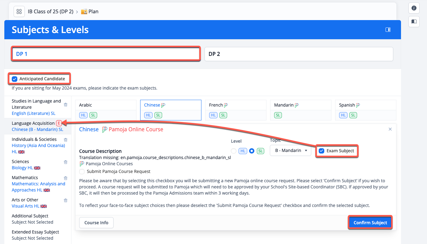 On your Grade 11 worksheet, the DP 1 tab, you must check the Anticipated Candidate checkbox if you will sit for an exam in your first year of the Diploma Programme. You can indicate the subjects that you will sitting the exam for by checking Exam Subject. An E will appear next to the appropriate subject name on the left. Make sure to Confirm Subject and then click Save Changes.
