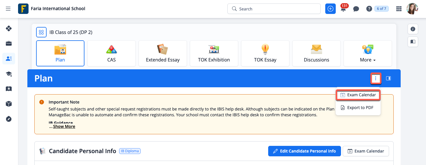 If your IB coordinator has registered you for DP exams via ManageBac+ and configured your exams calendar, you will be able to view the Exams calendar by clicking Exams Calendar in the 3 dot menu at the top of your plan worksheet.