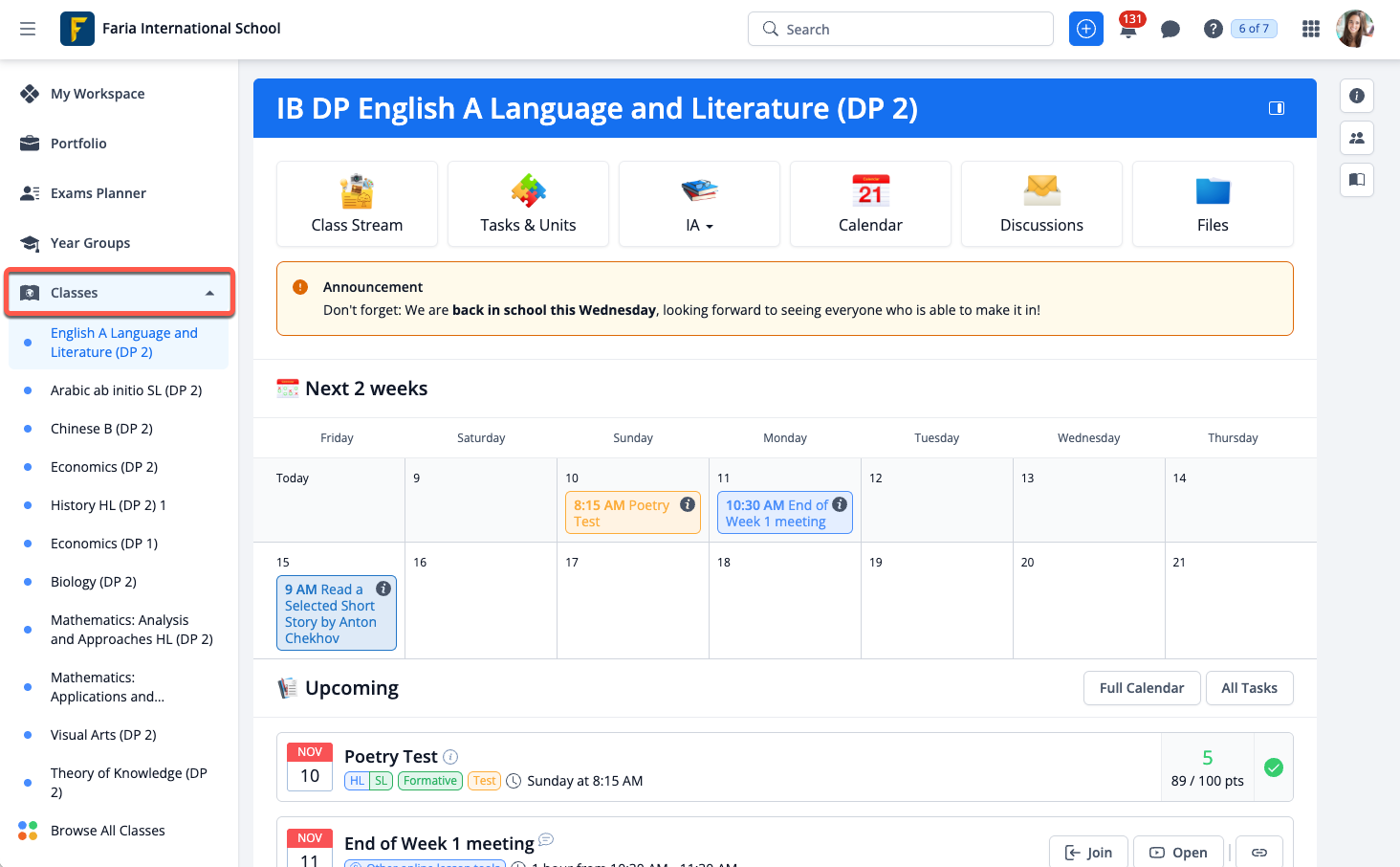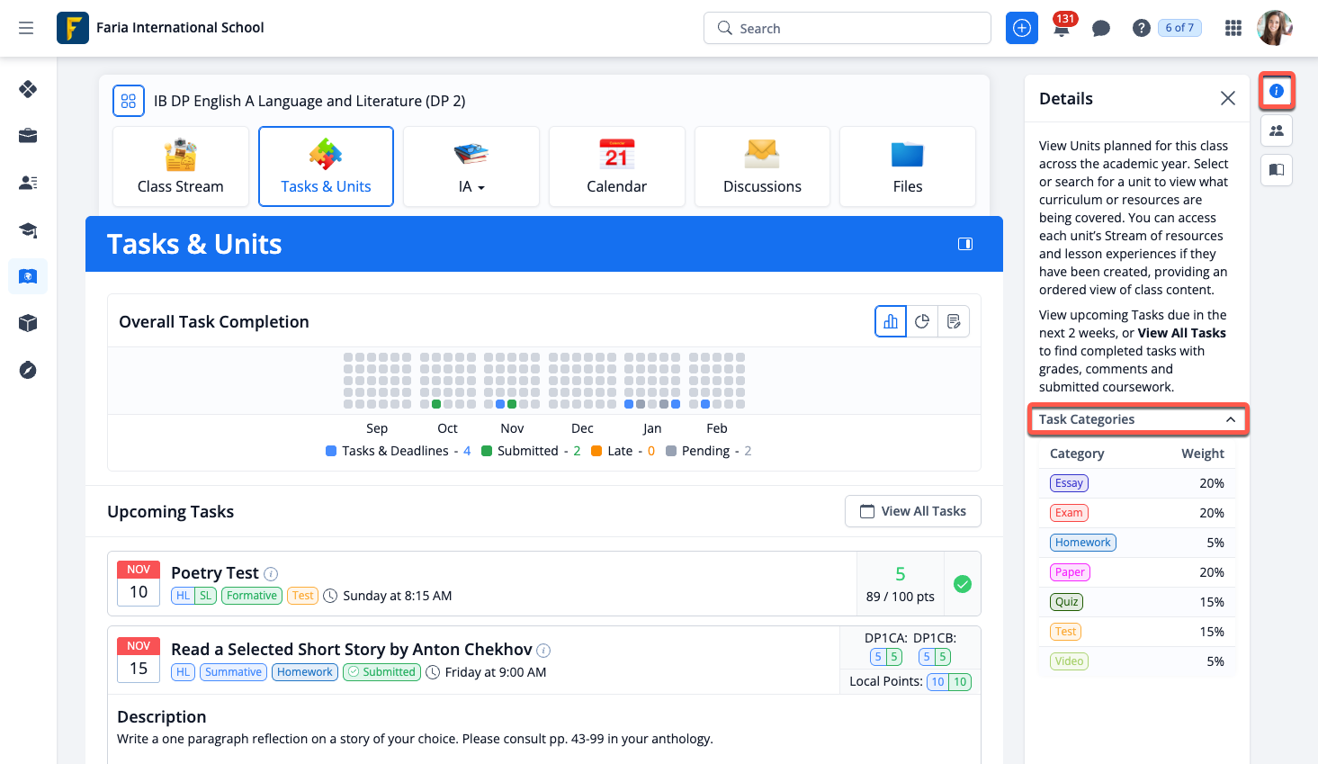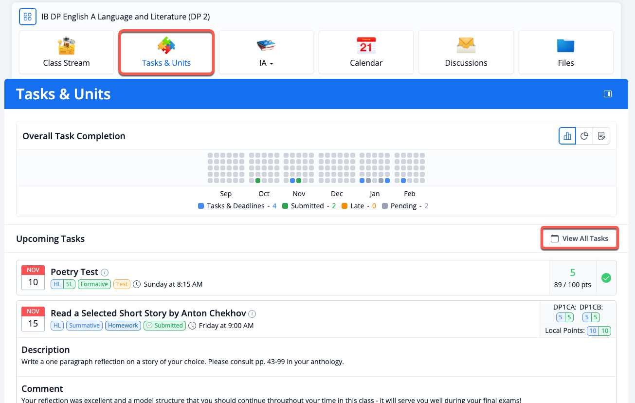 Navigate to the Tasks & Units page in your class. Here you will find an Overall Task Completion chart, a Unit calendar, a list of Upcoming Tasks, along with a list of units. Clicking on View All Tasks will give you further details.