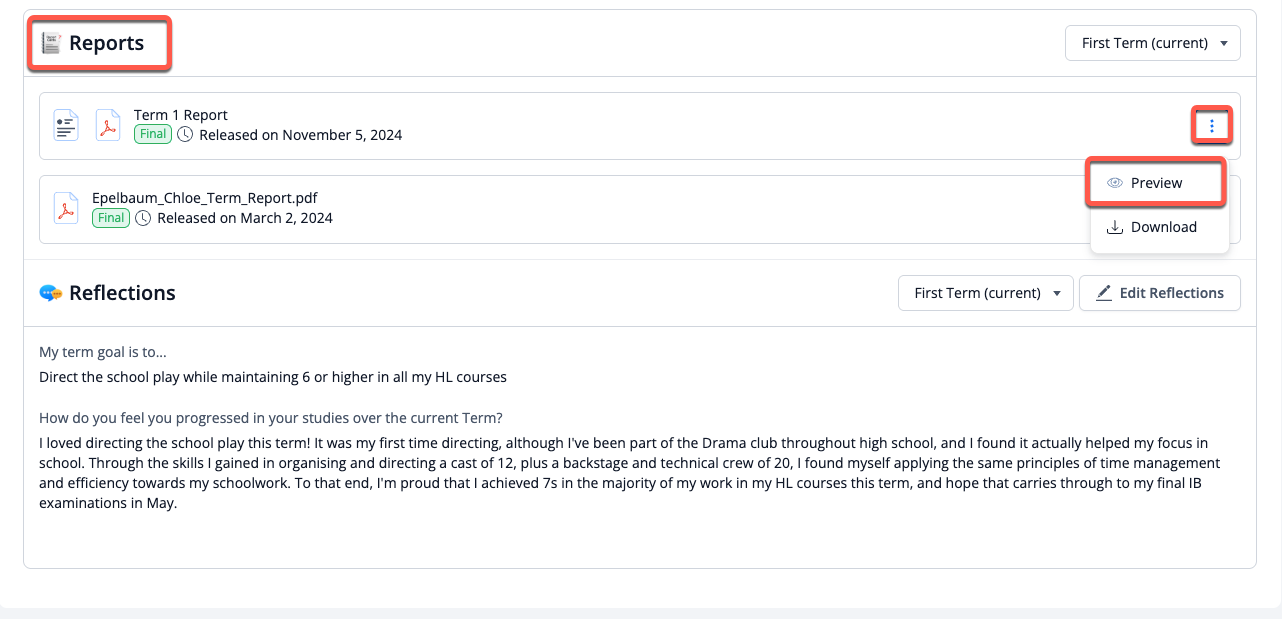 In the Reports section, you can find a list of generated report cards organized by academic year. Select an academic year/term from the drop down menu to view reports from previous years. You can click the three vertical dots to either Preview the Web version or Download the PDF report.