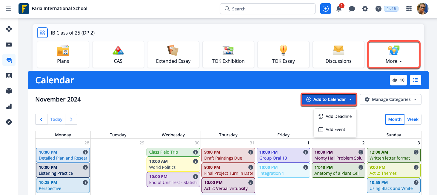 All class deadlines for the year group are also included on the calendar, so you can easily see if teachers are assigning major assignments and tasks on the same day or week. This calendar also includes any specific events and deadlines for the year group. Administrators can add an event or deadline by clicking Add to Calendar > Add Deadline or Add Event.