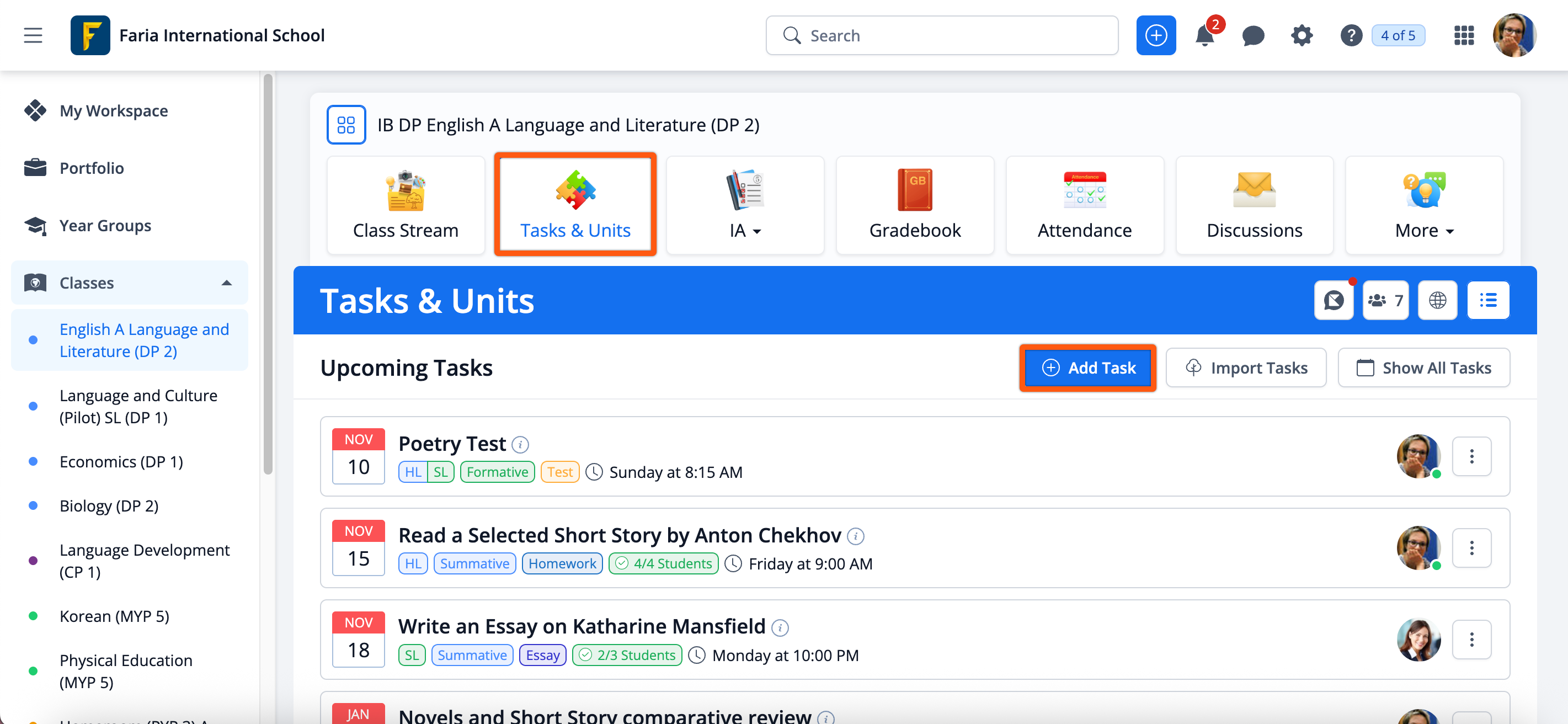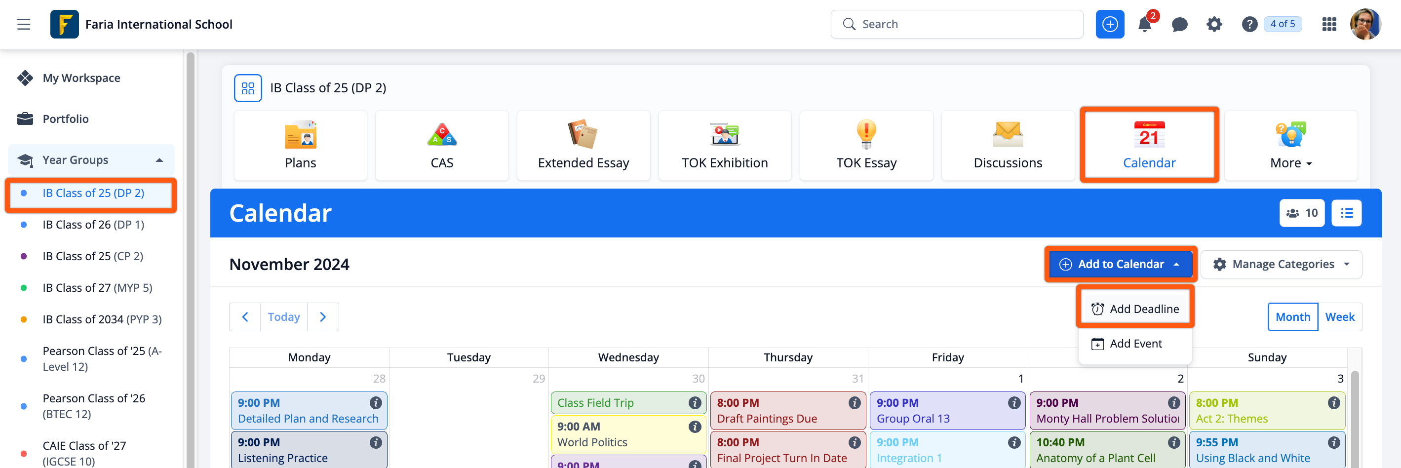 TurnItIn can be enabled on both class tasks and year group deadlines. Navigate to the year group Calendar tab and click Add New Deadline. Please note, creating Deadlines is restricted to Admin level users.
