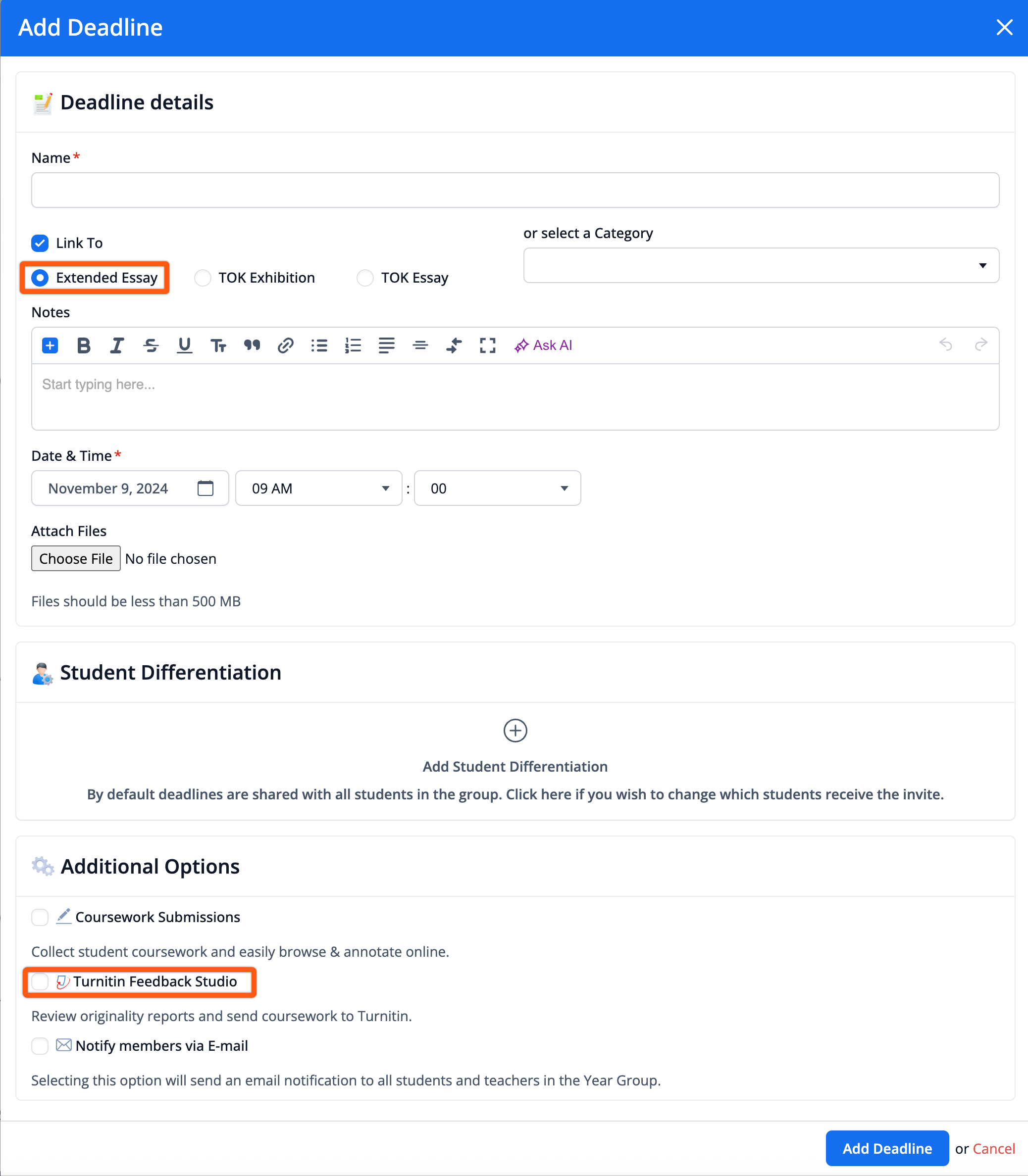 Here you can create a new Extended Essay or Theory of Knowledge deadline and tick the option to Enable Turnitin Feedback Studio. For MYP year groups, deadlines can be linked to the Personal Project. This will allow you to filter submitted coursework directly via TurnItIn. Add Deadline to save changes.