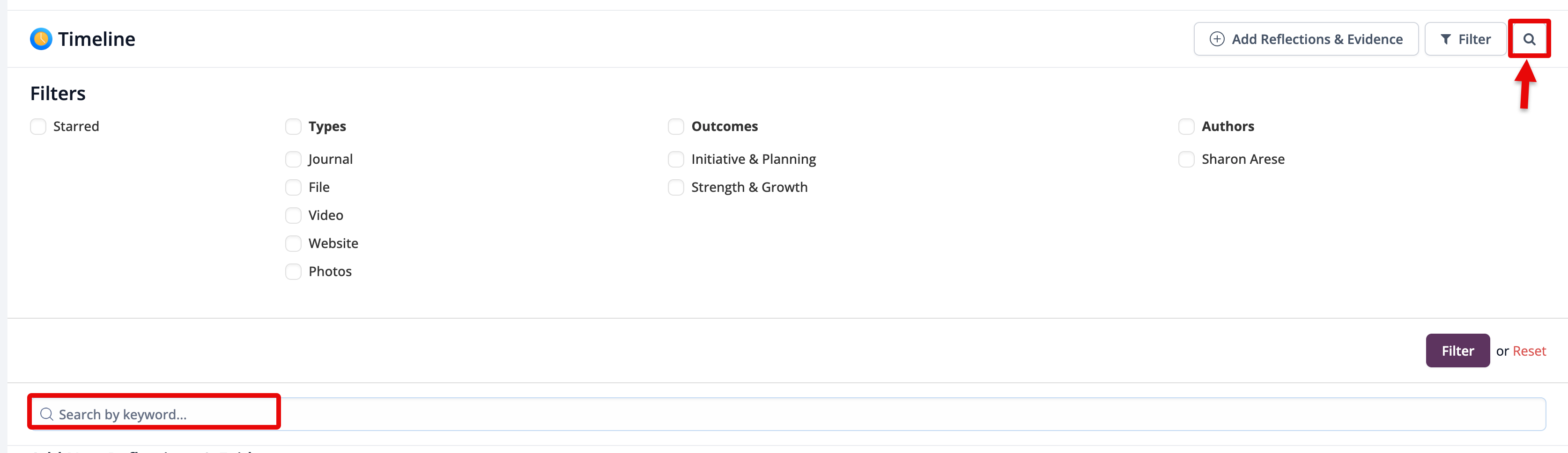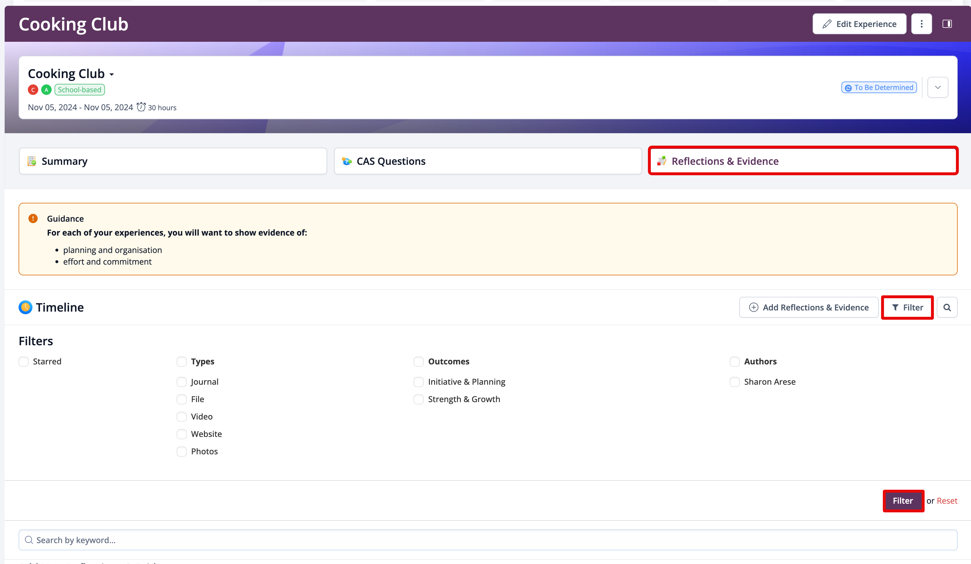 After adding reflections, you can access the Reflections & Evidence tab at the top of the page to view all your entries.