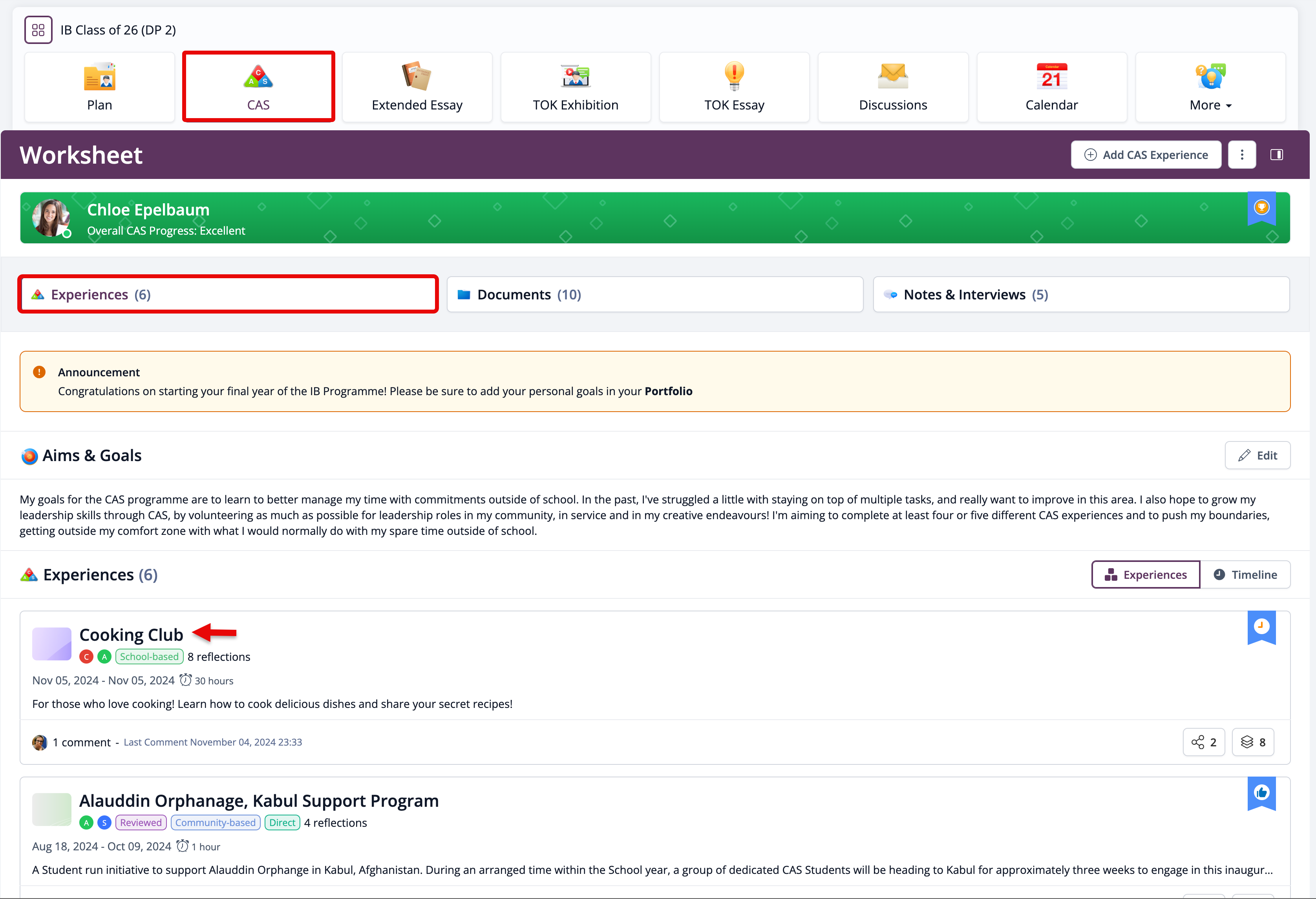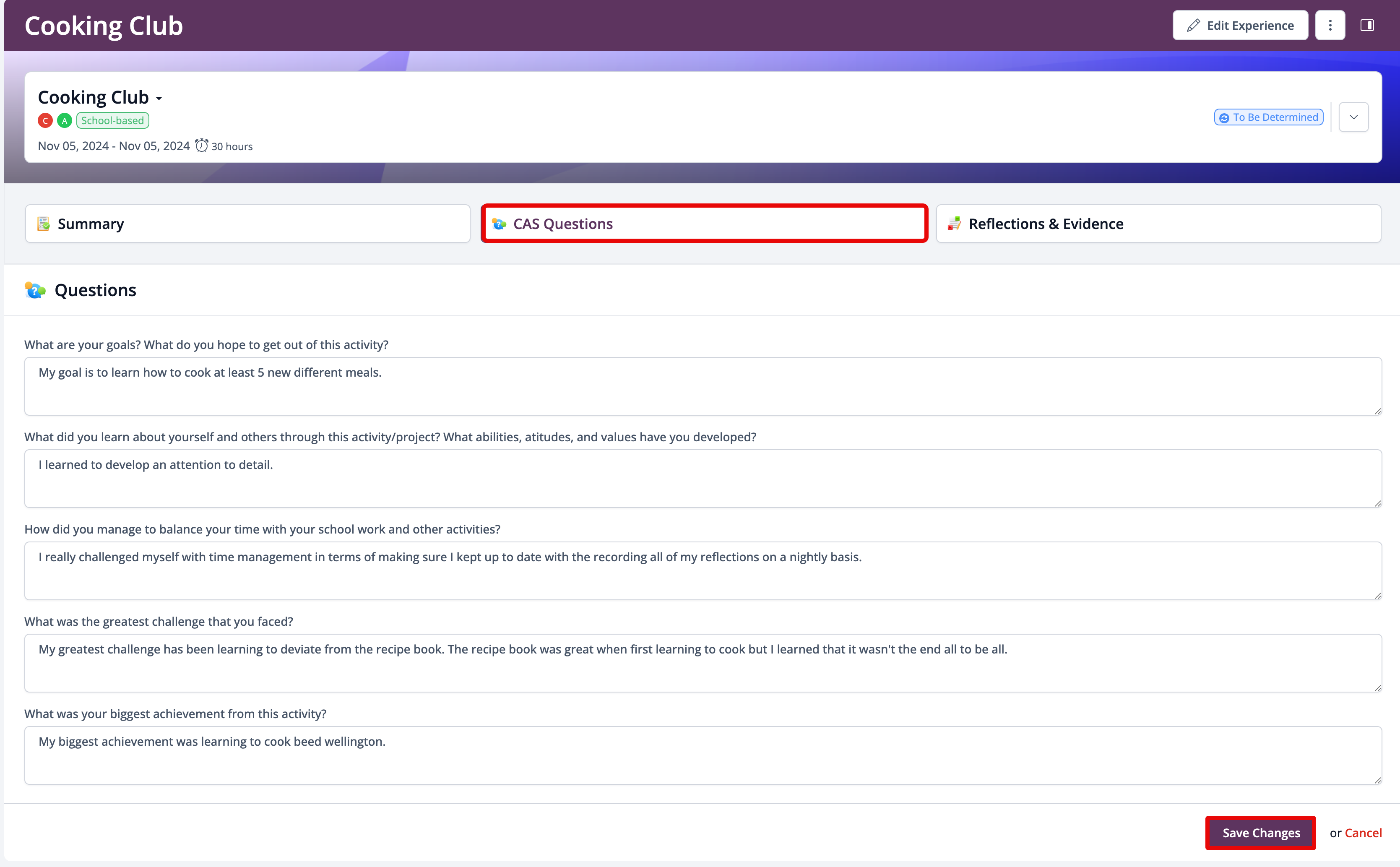 The CAS Questions tab will only be activated if your CAS Coordinator has created questions for you. If CAS Questions have been created, you can access the CAS Questions tab at the top of each experience page.