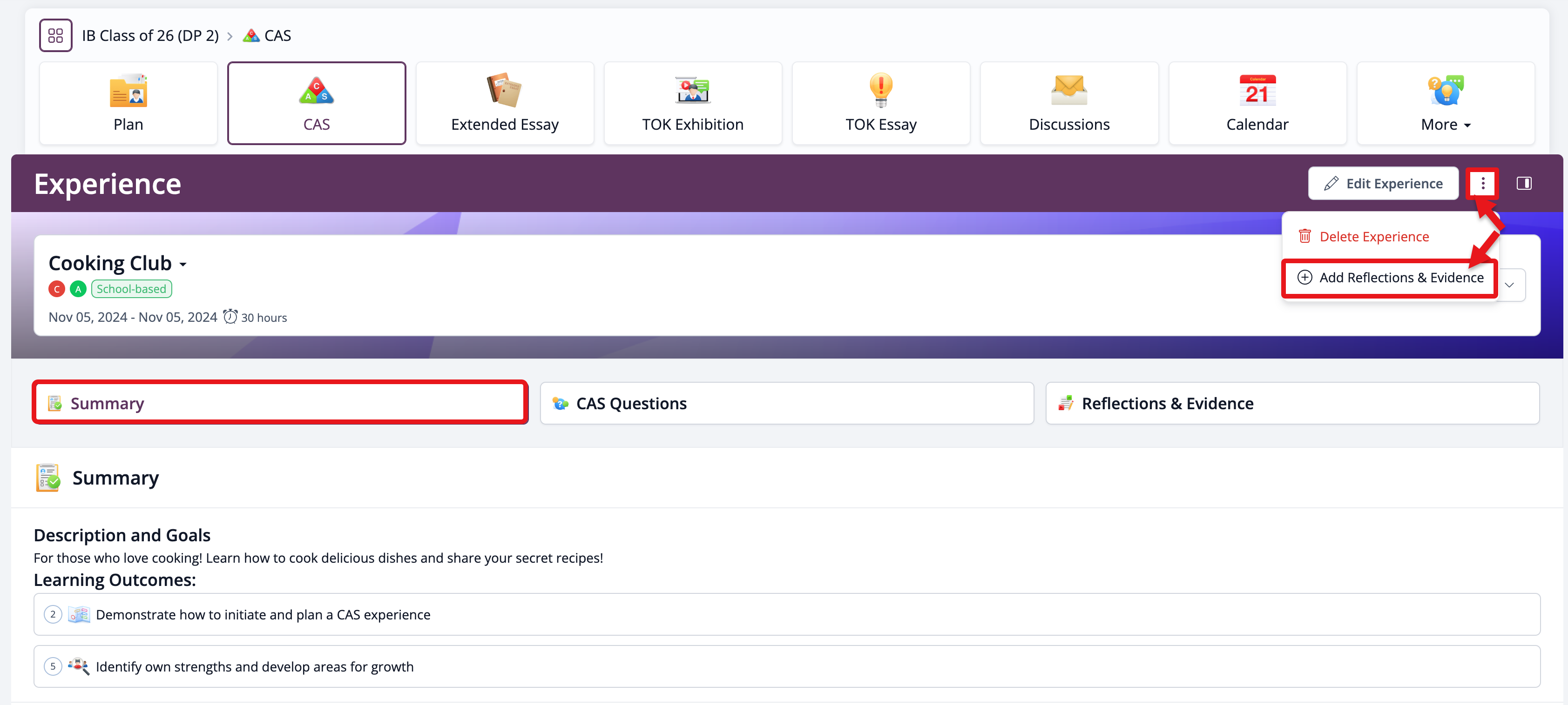 Once you’ve selected the experience, go to the Summary tab. Then, click on the three-dot icon in the top-right corner and select Add Reflections & Evidence, as shown in the image.