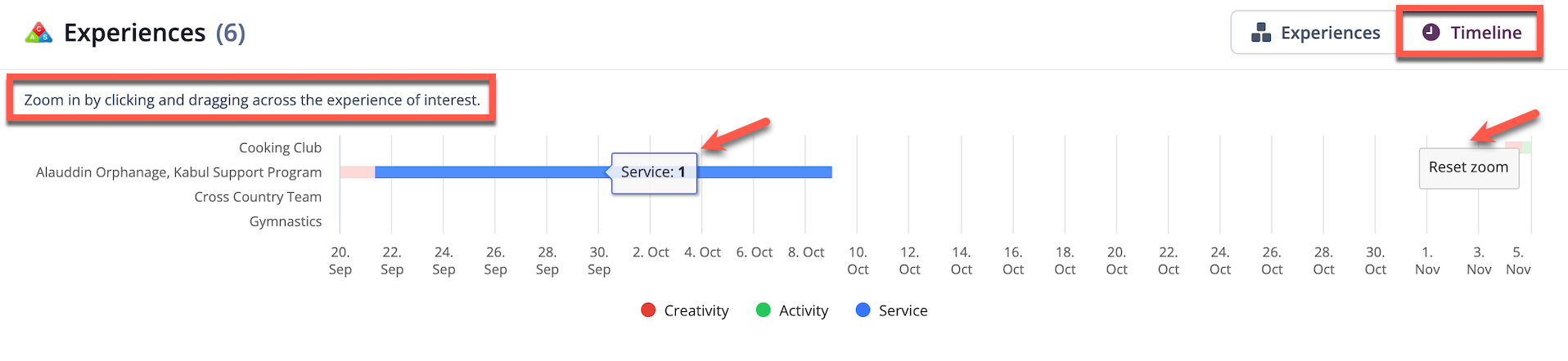 The Timeline tab shows the length of each experience, as well as the type of experience (Creativity, Action or Service) it is.