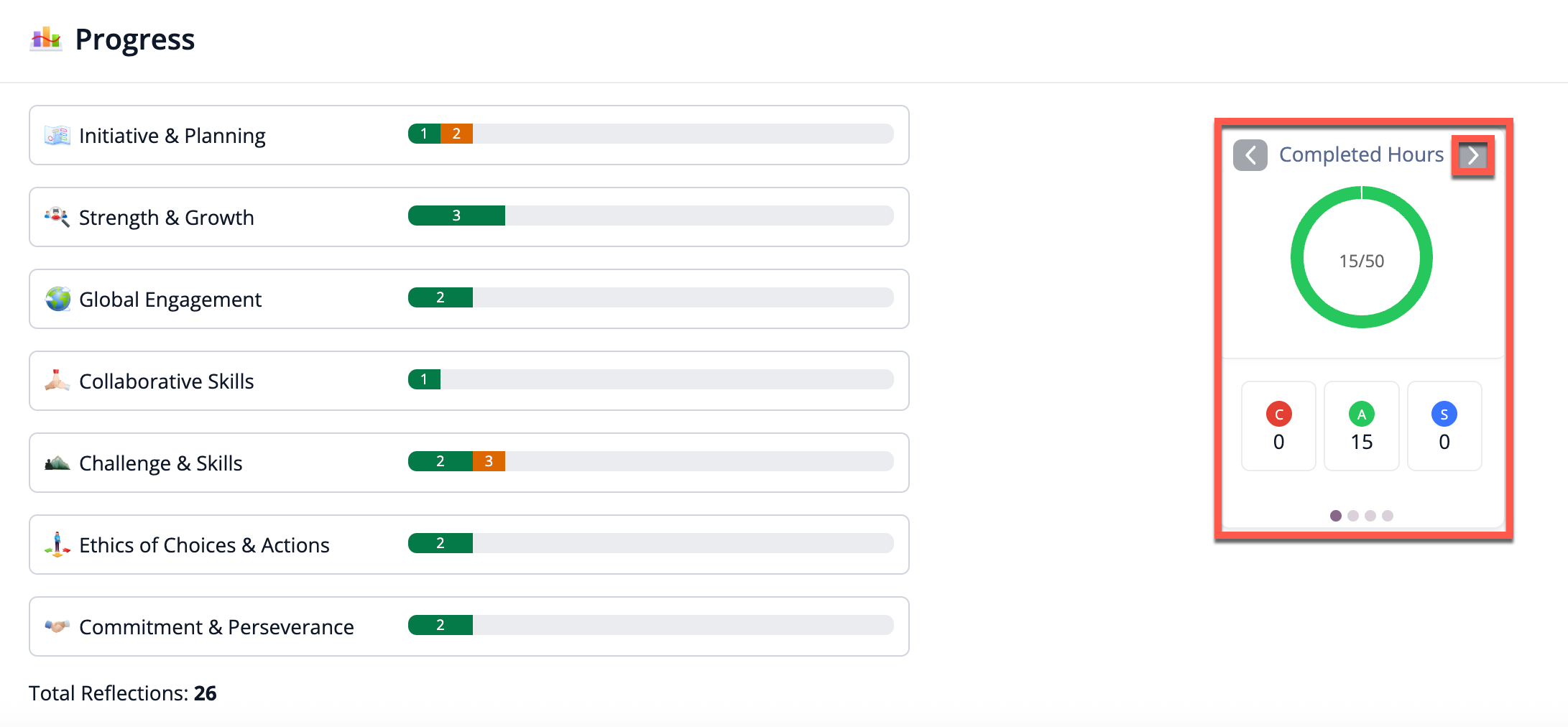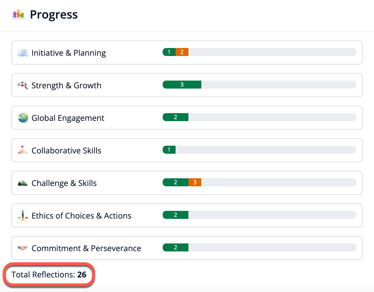 Thus as you add experiences, the orange bars will grow. As you add reflections and answer CAS questions, they will convert to green. If you have Orange items left in the chart, this means there are outcomes indicated that do not have a matching reflection or evidence.