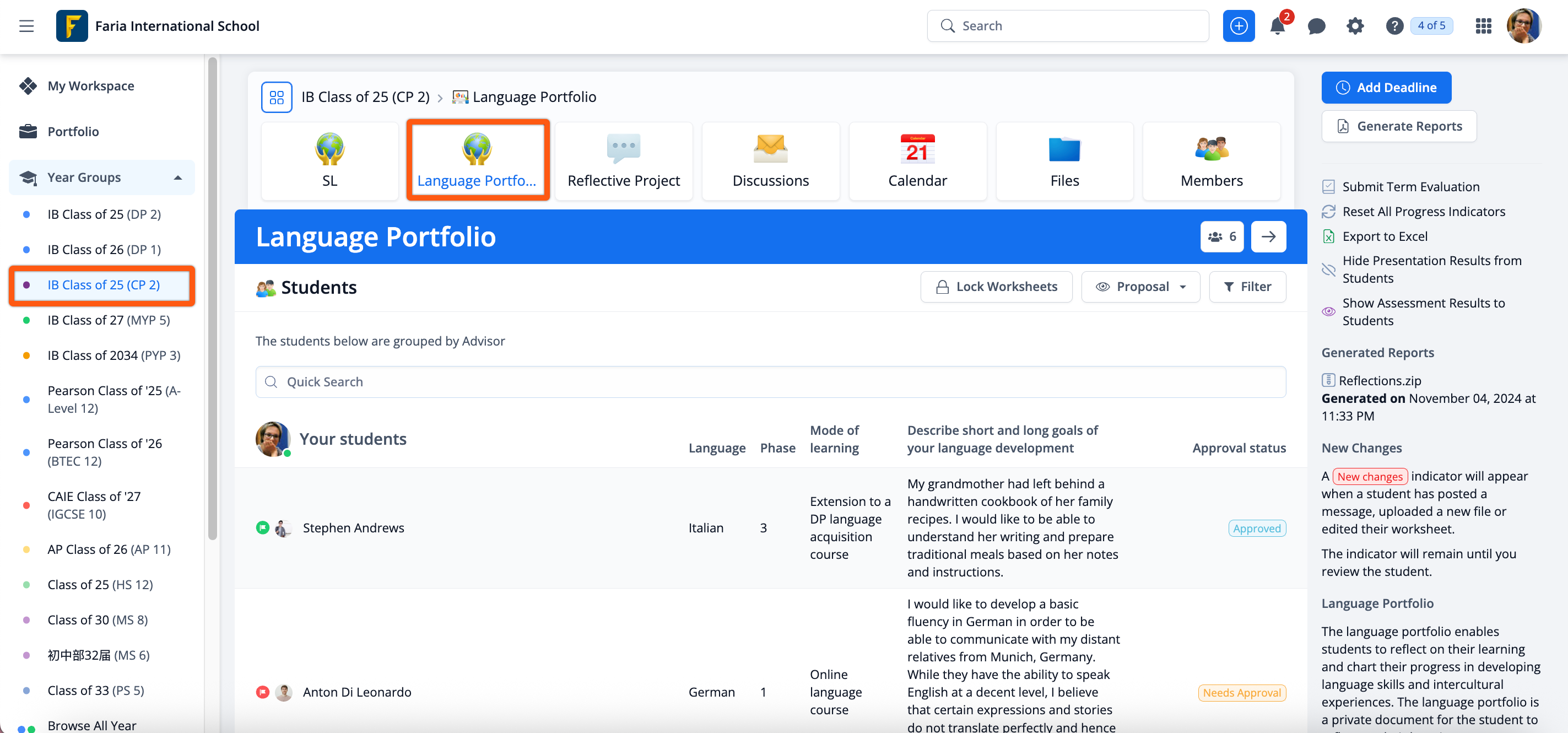 As an Project Coordinator or Advisor, you can review the status of your students from the Language Portfolio tab. The default view displays a list of the students assigned by Advisor with their Language, Phase, Mode of learning, goals and status (Needs Approval, Approved and Complete).