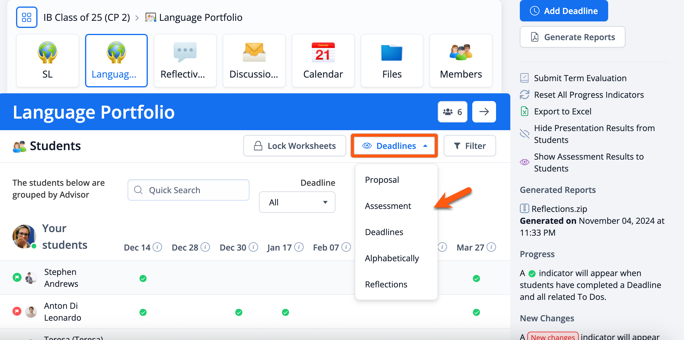 To view progress against a specific deadline, you can switch to the Deadlines option in the dropdown menu. This will allow you to see where each of your students stand relative to the global deadlines that have been set (e.g. submitting an outline, meeting with Advisor, etc.).